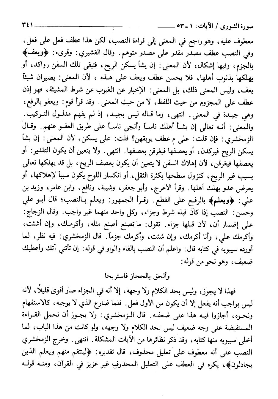 وَأَلْحَقُ بِالْحِجَازِ فَأَسْتَرِيحَا فَهَذَا لَا يَجُوزُ، وَلَيْسَ بِحَدِّ الْكَلَامِ وَلَا وَجْهِهِ، إِلَّا أَنَّهُ فِي الْجَزَاءِ صَارَ أَقْوَى قَلِيلًا، لِأَنَّهُ لَيْسَ بِوَاجِبٍ أَنَّهُ يَفْعَلُ إِلَّا أَنْ يَكُونَ مِنْ الْأَوَّلِ فِعْلٌ. فَلَمَّا ضَارَعَ الَّذِي لَا يُوجِبُهُ، كَالِاسْتِفْهَامِ وَنَحْوِهِ، أَجَازُوا فِيهِ هَذَا عَلَى ضَعْفِهِ. قَالَ الزَّمَخْشَرِيُّ: وَلَا يَجُوزُ أَنْ تُحْمَلَ الْقِرَاءَةُ الْمُسْتَفِيضَةُ عَلَى وَجْهٍ ضَعِيفٍ لَيْسَ بِحَدِّ الْكَلَامِ وَلَا وَجْهِهِ، وَلَوْ كَانَتْ مِنْ هَذَا الْبَابِ، لَمَا أَخْلَى سِيبَوَيْهِ مِنْهَا كِتَابَهُ، وَقَدْ ذَكَرَ نَظَائِرَهَا مِنَ الْآيَاتِ الْمُشْكَلَةِ. انْتَهَى. وَخَرَّجَ الزَّمَخْشَرِيُّ النَّصْبَ عَلَى أَنَّهُ مَعْطُوفٌ عَلَى تَعْلِيلٍ مَحْذُوفٍ، قَالَ تَقْدِيرُهُ: لِيَنْتَقِمَ مِنْهُمْ وَيَعْلَمَ الَّذِينَ يُجَادِلُونَ، يُكْرَهُ فِي الْعَطْفِ عَلَى التَّعْلِيلِ الْمَحْذُوفِ غَيْرُ عَزِيزٍ فِي الْقُرْآنِ، وَمِنْهُ قَوْلُهُ