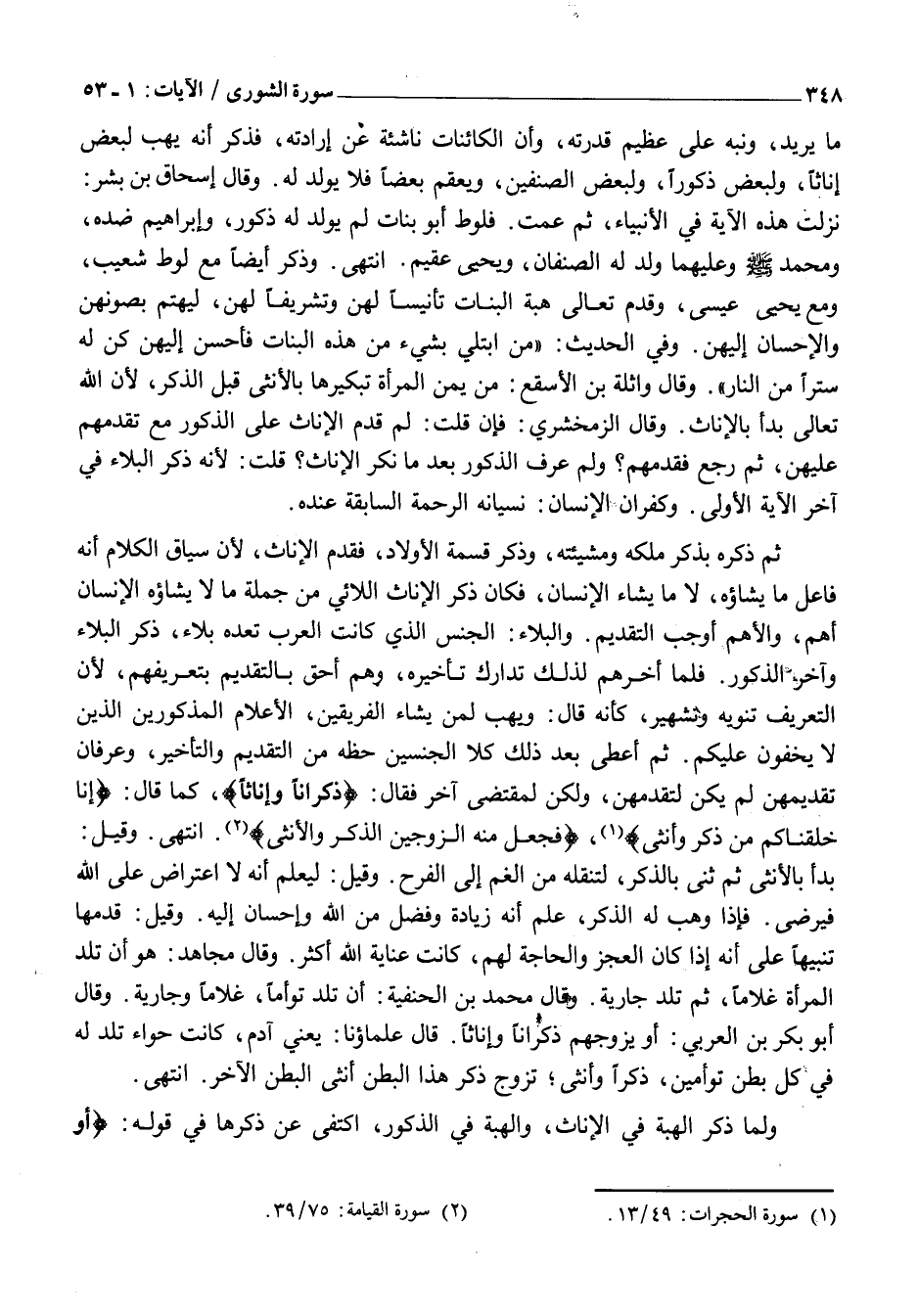 وَقَالَ وَاثِلَةُ بْنُ الْأَسْقَعِ: مِنْ يُمْنِ الْمَرْأَةِ تَبْكِيرُهَا بِالْأُنْثَى قَبْلَ الذَّكَرِ، لِأَنَّ اللَّهَ تَعَالَى بَدَأَ بِالْإِنَاثِ. وَقَالَ الزَّمَخْشَرِيُّ: فَإِنْ قُلْتَ: لِمَ قَدَّمَ الْإِنَاثَ عَلَى الذُّكُورِ مَعَ تَقَدُّمِهِمْ عَلَيْهِنَّ، ثُمَّ رَجَعَ فَقَدَّمَهُمْ؟ وَلِمَ عرف الذكور بعد ما نَكَّرَ الْإِنَاثَ؟ قُلْتُ: لِأَنَّهُ ذَكَرَ الْبَلَاءَ فِي آخِرِ الْآيَةِ الْأُولَى. وَكُفْرَانُ الْإِنْسَانِ: نِسْيَانُهُ الرَّحْمَةَ السَّابِقَةَ عِنْدَهُ.