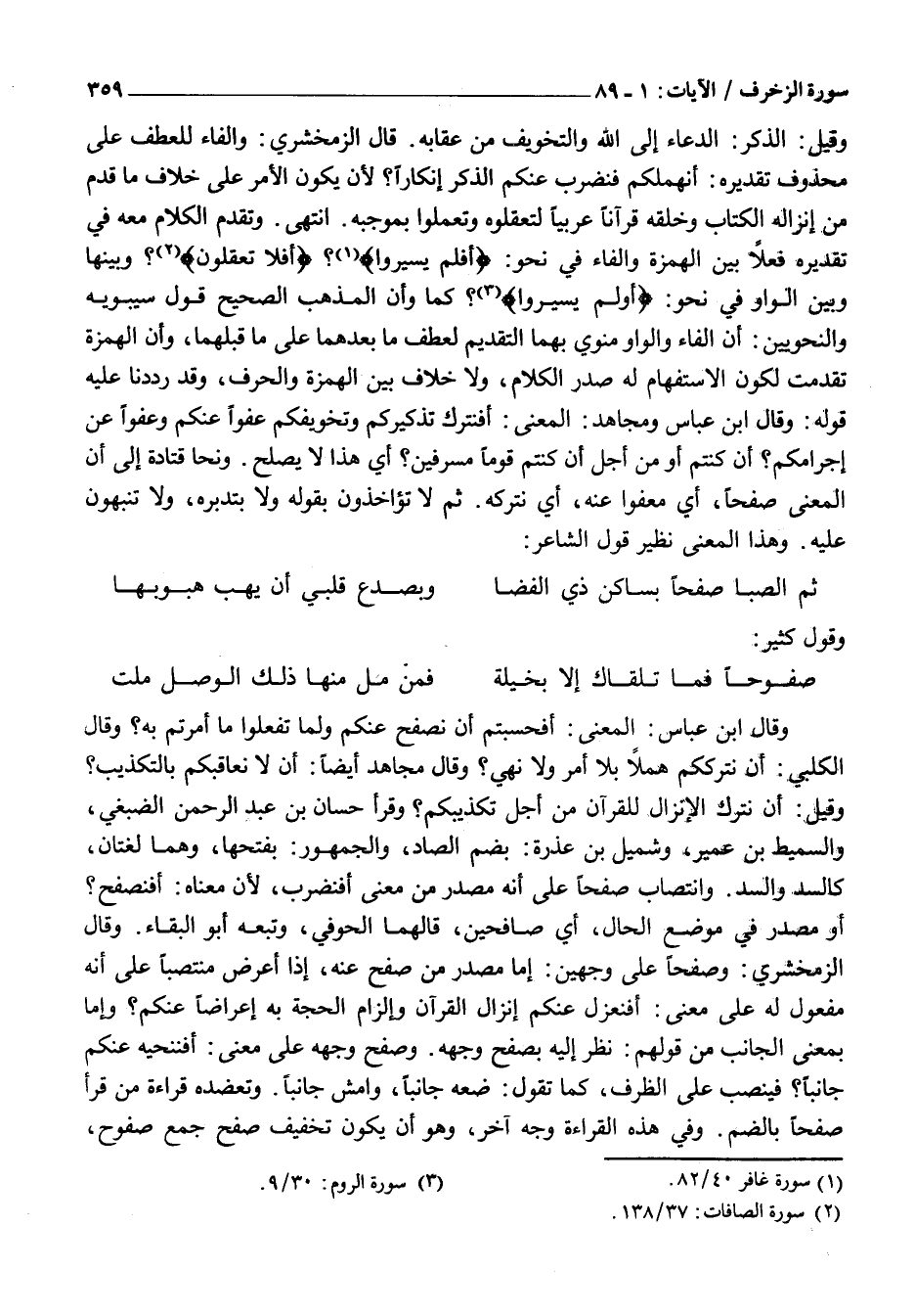 أَوْ مَصْدَرٌ فِي مَوْضِعِ الْحَالِ، أَيْ صَافِحِينَ، قَالَهُمَا الْحَوْفِيُّ، وَتَبِعَهُ أَبُو الْبَقَاءِ. وَقَالَ الزَّمَخْشَرِيُّ: وَصَفْحًا عَلَى وَجْهَيْنِ: إِمَّا مَصْدَرٌ مِنْ صَفَحَ عَنْهُ، إِذَا أَعْرَضَ مُنْتَصِبًا عَلَى أَنَّهُ مَفْعُولٌ لَهُ عَلَى مَعْنَى: أَفَنَعْزِلُ عَنْكُمْ إِنْزَالَ الْقُرْآنِ وَإِلْزَامَ الْحُجَّةِ بِهِ إِعْرَاضًا عَنْكُمْ؟ وَإِمَّا بِمَعْنَى الْجَانِبِ مِنْ قَوْلِهِمْ: نَظَرَ إِلَيْهِ بِصَفْحِ وَجْهِهِ. وَصَفْحُ وَجْهِهِ عَلَى مَعْنَى: أَفَنُنَحِّيهِ عَنْكُمْ جَانِبًا؟ فَيُنْصَبُ عَلَى الظَّرْفِ، كَمَا تَقُولُ: ضَعْهُ جَانِبًا، وَامْشِ جَانِبًا. وَتُعَضِّدُهُ قِرَاءَةُ مَنْ قَرَأَ صُفْحًا بِالضَّمِّ. وَفِي هَذِهِ الْقِرَاءَةِ وَجْهٍ آخَرَ، وَهُوَ أَنْ يكون تَخْفِيفَ صُفُحٍ جَمْعَ صُفُوحٍ،