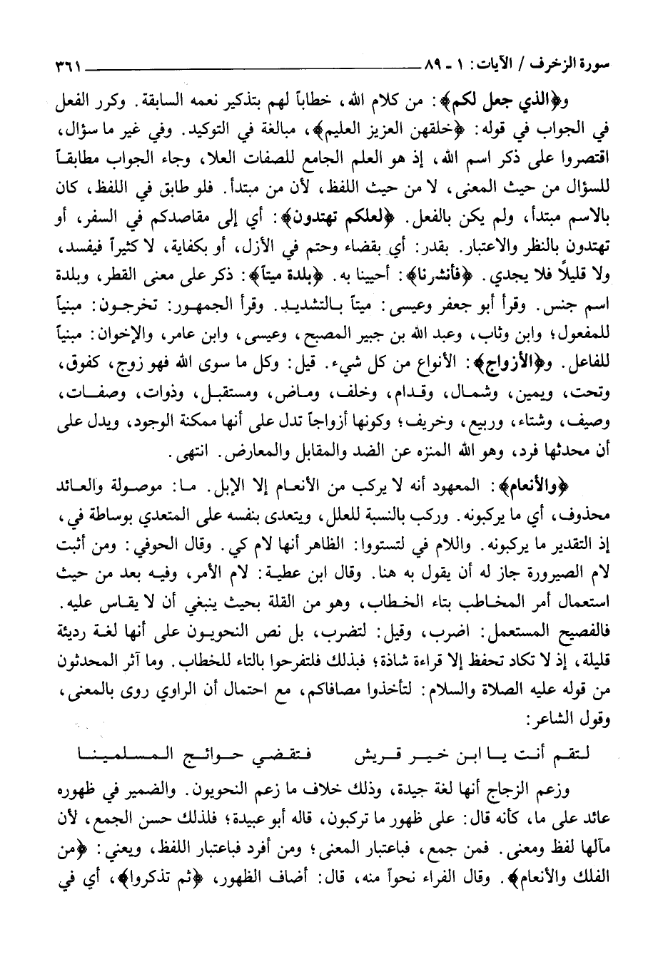 والَّذِي جَعَلَ لَكُمُ: مِنْ كَلَامِ اللَّهِ، خِطَابًا لَهُمْ بِتَذْكِيرِ نِعَمِهِ السَّابِقَةِ. وَكَرَّرَ الْفِعْلَ فِي الْجَوَابِ فِي قَوْلِهِ: خَلَقَهُنَّ الْعَزِيزُ الْعَلِيمُ، مُبَالَغَةً فِي التَّوْكِيدِ. وَفِي غَيْرِ مَا سُؤَالٍ، اقْتَصَرُوا عَلَى ذِكْرِ اسْمِ اللَّهِ، إِذْ هُوَ الْعَلَمُ الْجَامِعُ لِلصِّفَاتِ الْعُلَا، وَجَاءَ الْجَوَابُ مُطَابِقًا لِلسُّؤَالِ مِنْ حَيْثُ الْمَعْنَى، لَا مِنْ حيث اللفظ، لِأَنَّ مَنْ مُبْتَدَأٌ. فَلَوْ طَابَقَ فِي اللَّفْظِ، كَانَ بِالِاسْمِ مُبْتَدَأً، وَلَمْ يَكُنْ بِالْفِعْلِ. لَعَلَّكُمْ تَهْتَدُونَ: أَيْ إِلَى مَقَاصِدِكُمْ فِي السَّفَرِ، أَوْ تَهْتَدُونَ بِالنَّظَرِ وَالِاعْتِبَارِ. بِقَدَرٍ: أَيْ بِقَضَاءٍ وَحَتْمٍ فِي الْأَزَلِ، أَوْ بِكِفَايَةٍ، لَا كَثِيرًا فَيُفْسِدُ، وَلَا قَلِيلًا فَلَا يُجْدِي. فَأَنْشَرْنا: أَحْيَيْنَا بِهِ. بَلْدَةً مَيْتاً: ذُكِرَ عَلَى مَعْنَى الْقَطْرِ، وبلدة اسْمَ جِنْسٍ. وَقَرَأَ أَبُو جَعْفَرٍ وَعِيسَى: مَيِّتًا بِالتَّشْدِيدِ. وَقَرَأَ الْجُمْهُورُ: تُخْرَجُونَ: مَبْنِيًّا لِلْمَفْعُولِ وَابْنُ وَثَّابٍ، وَعَبْدُ اللَّهِ بْنُ جُبَيْرٍ الْمُصْبِحِ، وَعِيسَى، وَابْنُ عَامِرٍ، وَالْأَخَوَانِ: مبنيا للفاعل. والْأَزْواجَ: الْأَنْوَاعَ مِنْ كُلِّ شَيْءٍ. قِيلَ: وَكُلُّ مَا سِوَى اللَّهِ فَهُوَ زَوْجٌ، كَفَوْقَ، وَتَحْتَ، وَيَمِينٍ، وَشِمَالٍ، وَقُدَّامٍ، وَخَلْفٍ، وَمَاضٍ، وَمُسْتَقْبَلٍ، وَذَوَاتٍ، وَصِفَاتٍ، وَصَيْفٍ، وَشِتَاءٍ، وَرَبِيعٍ، وَخَرِيفٍ وَكَوْنُهَا أَزْوَاجًا تَدُلُّ عَلَى أَنَّهَا مُمْكِنَةُ الْوُجُودِ، وَيَدُلُّ عَلَى أَنَّ مُحْدِثَهَا فَرْدٌ، وَهُوَ اللَّهُ الْمُنَزَّهُ عَنِ الضِّدِّ وَالْمُقَابِلِ وَالْمُعَارِضِ. انْتَهَى.