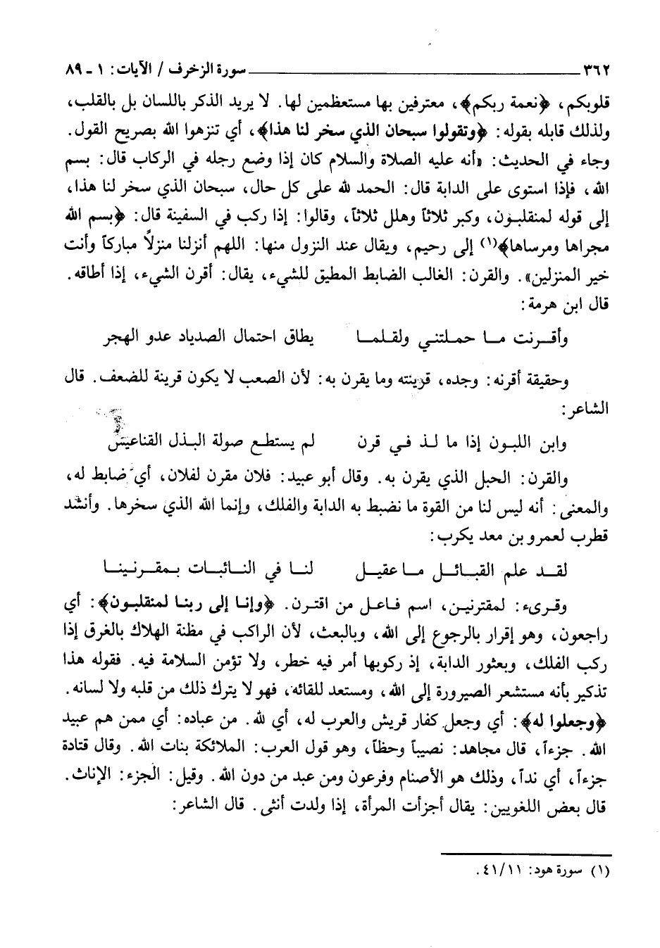 قُلُوبِكُمْ، نِعْمَةَ رَبِّكُمْ، مُعْتَرِفِينَ بِهَا مُسْتَعْظِمِينَ لَهَا. لَا يُرِيدُ الذِّكْرَ بِاللِّسَانِ بَلْ بِالْقَلْبِ، وَلِذَلِكَ قَابَلَهُ بِقَوْلِهِ: وَتَقُولُوا سُبْحانَ الَّذِي سَخَّرَ لَنا هَذَا، أَيْ تُنَزِّهُوا اللَّهَ بِصَرِيحِ الْقَوْلِ.