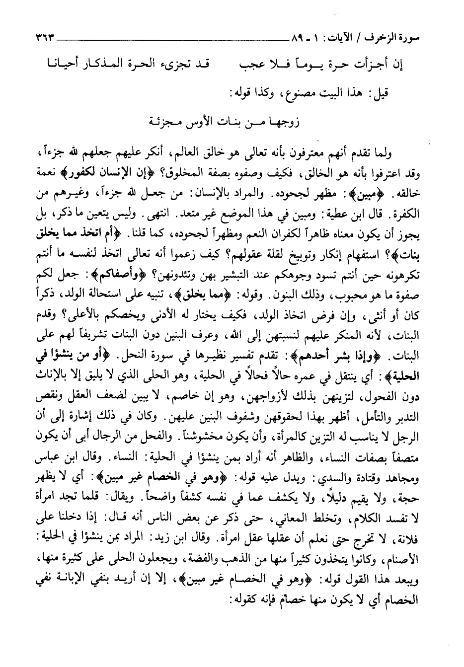 زَوَّجَهَا مِنْ بَنَاتِ الْأَوْسِ مُجْزِئَةً وَلَمَّا تَقَدَّمَ أَنَّهُمْ مُعْتَرِفُونَ بِأَنَّهُ تَعَالَى هُوَ خَالِقُ الْعَالَمِ، أَنْكَرَ عَلَيْهِمْ جَعْلَهُمْ لِلَّهِ جُزْءًا، وَقَدِ اعْتَرَفُوا بِأَنَّهُ هُوَ الْخَالِقُ، فَكَيْفَ وَصَفُوهُ بِصِفَةِ الْمَخْلُوقِ؟ إِنَّ الْإِنْسانَ لَكَفُورٌ نِعْمَةَ خَالِقِهِ. مُبِينٌ: مُظْهِرٌ لِجُحُودِهِ. وَالْمُرَادُ بِالْإِنْسَانِ: مَنْ جَعَلَ لِلَّهِ جُزْءًا، وَغَيْرُهُمْ مِنَ الْكَفَرَةِ. قَالَ ابْنُ عطية: ومبين فِي هَذَا الْمَوْضِعِ غَيْرُ مُتَعَدٍّ. انْتَهَى. وَلَيْسَ يَتَعَيَّنُ مَا ذُكِرَ، بَلْ يَجُوزُ أَنْ يَكُونَ مَعْنَاهُ ظَاهِرًا لِكُفْرَانِ النِّعَمِ وَمُظْهِرًا لِجُحُودِهِ، كَمَا قُلْنَا. أَمِ اتَّخَذَ مِمَّا يَخْلُقُ بَناتٍ؟ اسْتِفْهَامُ إِنْكَارٍ وَتَوْبِيخٍ لِقِلَّةِ عُقُولِهِمْ؟ كَيْفَ زَعَمُوا أَنَّهُ تَعَالَى اتَّخَذَ لِنَفْسِهِ مَا أَنْتُمْ تَكْرَهُونَهُ حِينَ أَنْتُمْ تَسْوَدُّ وُجُوهُكُمْ عِنْدَ التَّبْشِيرِ بِهِنَّ وَتَئِدُونَهُنَّ؟ وَأَصْفاكُمْ: جَعَلَ لَكُمْ صَفْوَةَ مَا هُوَ مَحْبُوبٌ، وَذَلِكَ الْبَنُونَ. وَقَوْلُهُ: مِمَّا يَخْلُقُ، تَنْبِيهٌ عَلَى اسْتِحَالَةِ الْوَلَدِ، ذَكَرًا كَانَ أَوْ أُنْثَى، وَإِنْ فُرِضَ اتِّخَاذُ الْوَلَدِ، فَكَيْفَ يَخْتَارُ لَهُ الْأَدْنَى وَيَخُصُّكُمْ بِالْأَعْلَى؟ وَقَدَّمَ الْبَنَاتِ، لِأَنَّهُ الْمُنْكَرُ عَلَيْهِمْ لِنِسْبَتِهِنَّ إِلَى اللَّهِ، وَعَرَّفَ الْبَنِينَ دُونَ الْبَنَاتِ تَشْرِيفًا لَهُمْ عَلَى الْبَنَاتِ. وَإِذا بُشِّرَ أَحَدُهُمْ: تَقَدَّمَ تَفْسِيرُ نَظِيرِهَا فِي سُورَةِ النَّحْلِ. أَوَمَنْ يُنَشَّؤُا فِي الْحِلْيَةِ: أَيْ يَنْتَقِلُ فِي عُمُرِهِ حَالًا فَحَالًا فِي الْحِلْيَةِ، وَهُوَ الْحُلِيُّ الَّذِي لَا يَلِيقُ إِلَّا بِالْإِنَاثِ دُونَ الْفُحُولِ، لِتَزَيُّنِهِنَّ بِذَلِكَ لِأَزْوَاجِهِنَّ، وَهُوَ إِنْ خَاصَمَ، لَا يُبِينُ لِضَعْفِ الْعَقْلِ وَنَقْصِ التَّدَبُّرِ وَالتَّأَمُّلِ، أَظْهَرَ بِهَذَا لِحُقُوقِهِنَّ وَشُفُوفِ الْبَنِينَ عَلَيْهِنَّ. وَكَانَ فِي ذَلِكَ إِشَارَةٌ إِلَى أَنَّ الرَّجُلَ لَا يُنَاسِبُ لَهُ التَّزَيُّنُ كَالْمَرْأَةِ، وَأَنْ يَكُونَ مُخْشَوْشِنًا. وَالْفَحْلُ مِنَ الرِّجَالِ أَبَى أَنْ يَكُونَ مُتَّصِفًا بِصِفَاتِ النِّسَاءِ، وَالظَّاهِرُ أَنَّهُ أراد بمن ينشؤا فِي الْحِلْيَةِ: النِّسَاءِ. وَقَالَ ابْنُ عَبَّاسٍ وَمُجَاهِدٌ وَقَتَادَةُ وَالسُّدِّيُّ: وَيَدُلُّ عَلَيْهِ قَوْلُهُ: وَهُوَ فِي الْخِصامِ غَيْرُ مُبِينٍ: أَيْ لَا يُظْهِرُ حُجَّةً، وَلَا يُقِيمُ دَلِيلًا، وَلَا يَكْشِفُ عَمَّا فِي نَفْسِهِ كَشْفًا وَاضِحًا. وَيُقَالُ: قَلَّمَا تَجِدُ امْرَأَةً لَا تُفْسِدُ الْكَلَامَ، وَتَخْلِطُ الْمَعَانِيَ، حَتَّى ذُكِرَ عَنْ بَعْضِ النَّاسِ أَنَّهُ قَالَ: إِذَا دَخَلْنَا عَلَى فُلَانَةٍ، لَا تخرج حَتَّى نَعْلَمَ أَنَّ عَقْلَهَا عَقْلُ امْرَأَةٍ. وَقَالَ ابْنُ زَيْدٍ: الْمُرَادُ بمن ينشؤا فِي الْحِلْيَةِ: