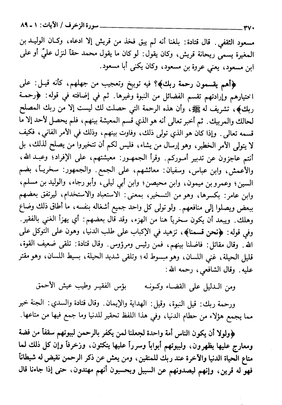 وَلَوْلا أَنْ يَكُونَ النَّاسُ أُمَّةً واحِدَةً لَجَعَلْنا لِمَنْ يَكْفُرُ بِالرَّحْمنِ لِبُيُوتِهِمْ سُقُفاً مِنْ فِضَّةٍ وَمَعارِجَ عَلَيْها يَظْهَرُونَ، وَلِبُيُوتِهِمْ أَبْواباً وَسُرُراً عَلَيْها يَتَّكِؤُنَ، وَزُخْرُفاً وَإِنْ كُلُّ ذلِكَ لَمَّا مَتاعُ الْحَياةِ الدُّنْيا وَالْآخِرَةُ عِنْدَ رَبِّكَ لِلْمُتَّقِينَ، وَمَنْ يَعْشُ عَنْ ذِكْرِ الرَّحْمنِ نُقَيِّضْ لَهُ شَيْطاناً فَهُوَ لَهُ قَرِينٌ، وَإِنَّهُمْ لَيَصُدُّونَهُمْ عَنِ السَّبِيلِ وَيَحْسَبُونَ أَنَّهُمْ مُهْتَدُونَ، حَتَّى إِذا جاءَنا قالَ