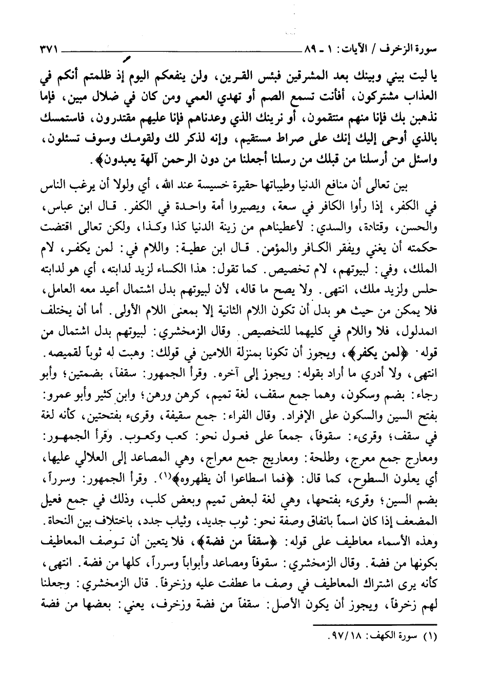 بَيَّنَ تَعَالَى أَنَّ مَنَافِعَ الدُّنْيَا وَطَيِّبَاتِهَا حَقِيرَةٌ خَسِيسَةٌ عِنْدَ اللَّهِ، أَيْ وَلَوْلَا أَنْ يَرْغَبَ النَّاسُ فِي الكفر، إذ رَأَوُا الْكَافِرَ فِي سَعَةٍ، وَيَصِيرُوا أُمَّةً وَاحِدَةً فِي الْكُفْرِ. قَالَ ابْنُ عَبَّاسٍ، وَالْحَسَنُ، وَقَتَادَةُ، وَالسُّدِّيُّ: لَأَعْطَيْنَاهُمْ مِنْ زِينَةِ الدُّنْيَا كَذَا وَكَذَا، وَلَكِنْ تَعَالَى اقْتَضَتْ حِكْمَتُهُ أَنْ يُغْنِيَ وَيُفْقِرَ الْكَافِرَ وَالْمُؤْمِنَ. قَالَ ابْنُ عَطِيَّةَ: وَاللَّامُ فِي: لِمَنْ يَكْفُرُ، لَامُ الْمِلْكِ، وَفِي: لِبُيُوتِهِمْ، لَامُ تَخْصِيصٍ. كَمَا تَقُولُ: هَذَا الْكِسَاءُ لِزَيْدٍ لِدَابَّتِهِ، أَيْ هُوَ لِدَابَّتِهِ حِلْسٌ وَلِزَيْدٍ مِلْكٌ، انْتَهَى. وَلَا يَصِحُّ مَا قَالَهُ، لِأَنَّ لِبُيُوتِهِمْ بَدَلُ اشْتِمَالٍ أُعِيدَ مَعَهُ الْعَامِلُ، فَلَا يُمْكِنُ مِنْ حَيْثُ هُوَ بَدَلٌ أَنْ تَكُونَ اللَّامُ الثَّانِيَةُ إِلَّا بِمَعْنَى اللَّامِ الْأُولَى. أَمَّا أَنْ يَخْتَلِفَ الْمَدْلُولُ، فَلَا وَاللَّامُ فِي كِلَيْهِمَا لِلتَّخْصِيصِ. وَقَالَ الزَّمَخْشَرِيُّ: لِبُيُوتِهِمْ بَدَلُ اشْتِمَالٍ مِنْ قَوْلِهِ: لِمَنْ يَكْفُرُ، وَيَجُوزُ أَنْ تَكُونَا بِمَنْزِلَةِ اللَّامَيْنِ فِي قَوْلِكَ: وَهَبْتُ لَهُ ثُوبًا لِقَمِيصِهِ.
