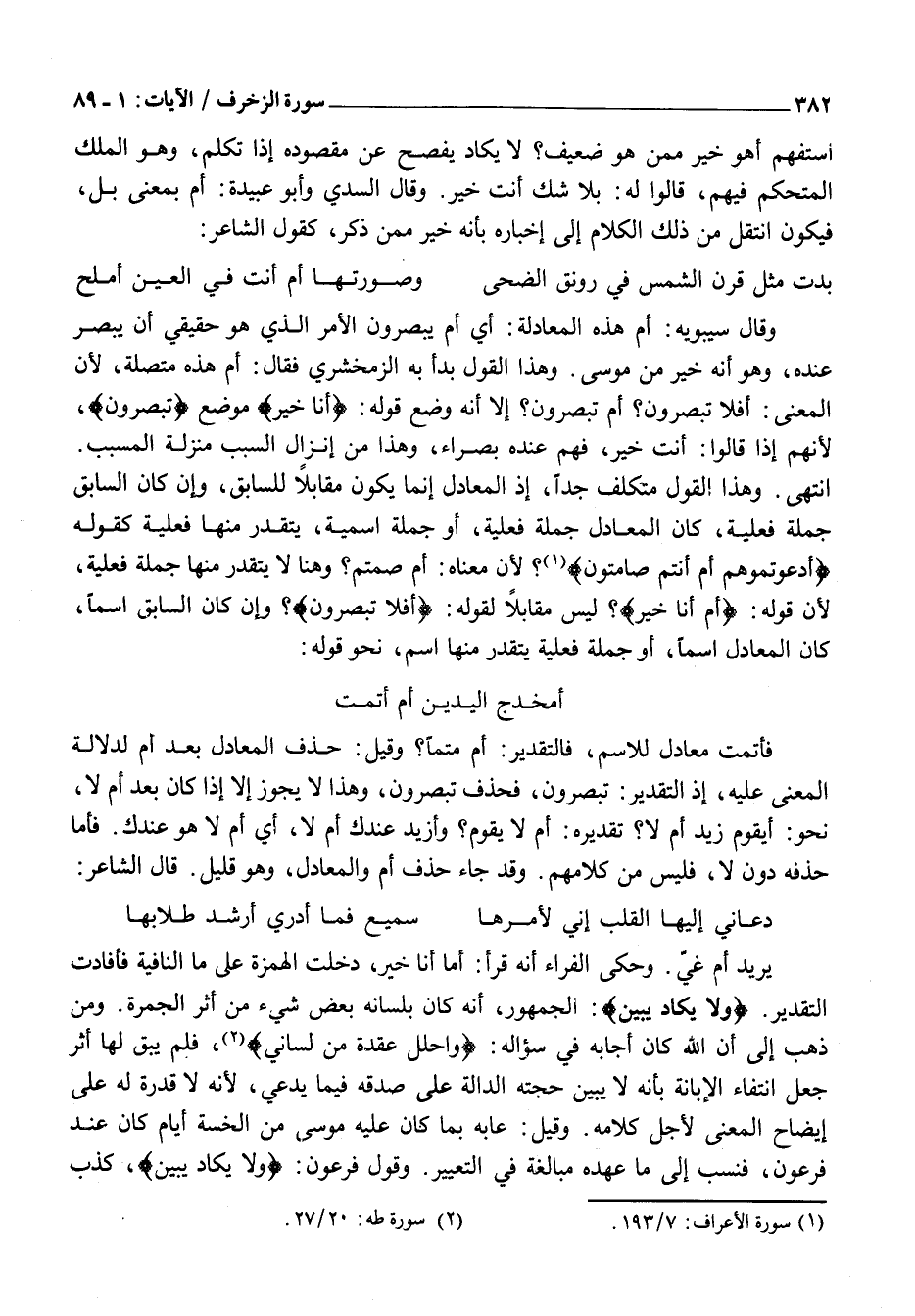 وَقَالَ سِيبَوَيْهِ: أَمْ هَذِهِ الْمُعَادِلَةُ: أَيْ أَمْ يُبْصِرُونَ الْأَمْرَ الَّذِي هُوَ حَقِيقِيٌّ أَنْ يُبْصَرَ عِنْدَهُ، وَهُوَ أَنَّهُ خَيْرٌ مِنْ مُوسَى. وَهَذَا الْقَوْلُ بَدَأَ بِهِ الزَّمَخْشَرِيُّ فَقَالَ: أَمْ هَذِهِ مُتَّصِلَةٌ، لِأَنَّ الْمَعْنَى: أَفَلَا تُبْصِرُونَ؟ أَمْ تُبْصِرُونَ؟ إِلَّا أَنَّهُ وَضَعَ قَوْلَهُ: أَنَا خَيْرٌ مَوْضِعَ تُبْصِرُونَ، لِأَنَّهُمْ إِذَا قَالُوا: أَنْتَ خَيْرٌ، فَهُمْ عِنْدَهُ بُصَرَاءُ، وَهَذَا مِنْ إِنْزَالِ السَّبَبِ مَنْزِلَةَ الْمُسَبِّبِ.