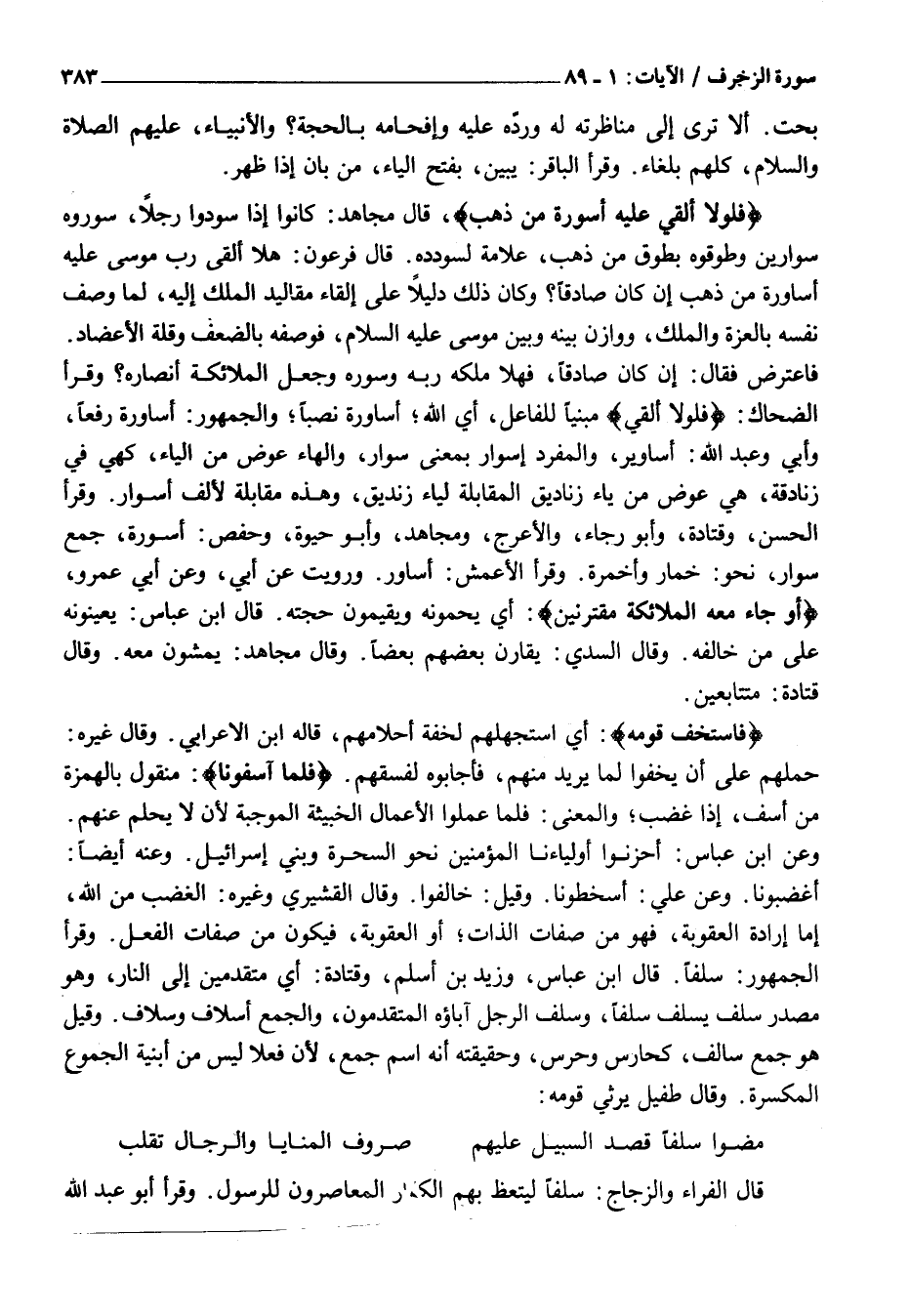فَاعْتَرَضَ فَقَالَ: إِنْ كَانَ صَادِقًا، فَهَلَّا مَلَّكَهُ رَبُّهُ وَسَوَّرَهُ وَجَعَلَ الْمَلَائِكَةَ أَنْصَارَهُ؟ وَقَرَأَ الضَّحَّاكُ: فَلَوْلا أُلْقِيَ مَبْنِيًّا لِلْفَاعِلِ، أَيِ اللَّهُ أَسَاوِرَةً نَصْبًا وَالْجُمْهُورُ: أَسَاوِرَةٌ رَفْعًا، وَأُبَيٌّ وَعَبْدُ اللَّهِ: أَسَاوِيرُ، وَالْمُفْرَدُ إِسْوَارٌ بِمَعْنَى سُوَارٍ، وَالْهَاءُ عِوَضٌ مِنَ الْيَاءِ، كَهِيَ فِي زَنَادِقَةٍ، هِيَ عِوَضٌ مِنْ يَاءِ زَنَادِيقَ الْمُقَابِلَةِ لِيَاءِ زِنْدِيقٍ، وَهَذِهِ مُقَابِلَةٌ لِأَلِفِ أَسْوَارٍ. وَقَرَأَ الْحَسَنُ، وَقَتَادَةُ، وَأَبُو رَجَاءٍ، وَالْأَعْرَجُ، وَمُجَاهِدٌ، وَأَبُو حَيْوَةَ، وَحَفْصٌ: أَسْوِرَةٌ، جَمْعَ سُوَارٍ، نَحْوُ: خِمَارٍ وَأَخْمِرَةٍ. وَقَرَأَ الْأَعْمَشُ: أَسَاوِرُ. وَرُوِيَتْ عَنْ أُبَيٍّ، وَعَنْ أَبِي عَمْرٍو، أَوْ جاءَ مَعَهُ الْمَلائِكَةُ مُقْتَرِنِينَ: أَيْ يَحْمُونَهُ وَيُقِيمُونَ حُجَّتَهُ. قَالَ ابْنُ عَبَّاسٍ: يُعِينُونَهُ عَلَى مَنْ خَالَفَهُ. وَقَالَ السُّدِّيُّ: يُقَارِنُ بَعْضُهُمْ بَعْضًا. وَقَالَ مُجَاهِدٌ: يَمْشُونَ مَعَهُ. وَقَالَ قَتَادَةُ: مُتَتَابِعِينَ.