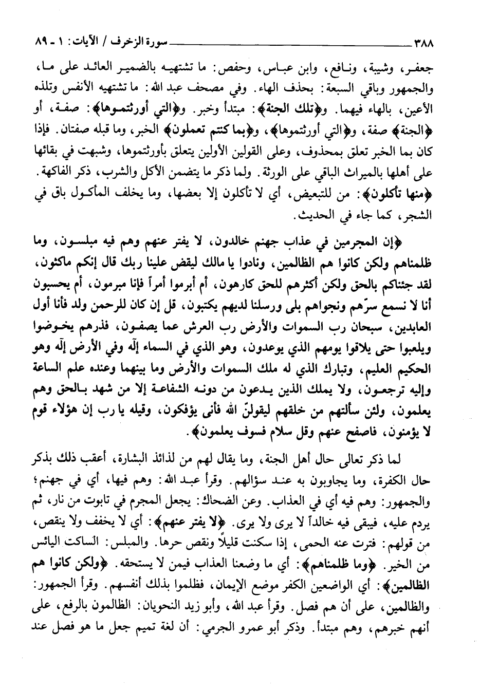 إِنَّ الْمُجْرِمِينَ فِي عَذابِ جَهَنَّمَ خالِدُونَ، لَا يُفَتَّرُ عَنْهُمْ وَهُمْ فِيهِ مُبْلِسُونَ، وَما ظَلَمْناهُمْ وَلكِنْ كانُوا هُمُ الظَّالِمِينَ، وَنادَوْا يَا مالِكُ لِيَقْضِ عَلَيْنا رَبُّكَ قالَ إِنَّكُمْ ماكِثُونَ، لَقَدْ جِئْناكُمْ بِالْحَقِّ وَلكِنَّ أَكْثَرَكُمْ لِلْحَقِّ كارِهُونَ، أَمْ أَبْرَمُوا أَمْراً فَإِنَّا مُبْرِمُونَ، أَمْ يَحْسَبُونَ أَنَّا لَا نَسْمَعُ سِرَّهُمْ وَنَجْواهُمْ بَلى وَرُسُلُنا لَدَيْهِمْ يَكْتُبُونَ، قُلْ إِنْ كانَ لِلرَّحْمنِ وَلَدٌ فَأَنَا أَوَّلُ الْعابِدِينَ، سُبْحانَ رَبِّ السَّماواتِ وَالْأَرْضِ رَبِّ الْعَرْشِ عَمَّا يَصِفُونَ، فَذَرْهُمْ يَخُوضُوا وَيَلْعَبُوا حَتَّى يُلاقُوا يَوْمَهُمُ الَّذِي يُوعَدُونَ، وَهُوَ الَّذِي فِي السَّماءِ إِلهٌ وَفِي الْأَرْضِ إِلهٌ وَهُوَ الْحَكِيمُ الْعَلِيمُ، وَتَبارَكَ الَّذِي لَهُ مُلْكُ السَّماواتِ وَالْأَرْضِ وَما بَيْنَهُما وَعِنْدَهُ عِلْمُ السَّاعَةِ وَإِلَيْهِ تُرْجَعُونَ، وَلا يَمْلِكُ الَّذِينَ يَدْعُونَ مِنْ دُونِهِ الشَّفاعَةَ إِلَّا مَنْ شَهِدَ بِالْحَقِّ وَهُمْ يَعْلَمُونَ، وَلَئِنْ سَأَلْتَهُمْ مَنْ خَلَقَهُمْ لَيَقُولُنَّ اللَّهُ فَأَنَّى يُؤْفَكُونَ، وَقِيلِهِ يَا رَبِّ إِنَّ هؤُلاءِ قَوْمٌ لَا يُؤْمِنُونَ، فَاصْفَحْ عَنْهُمْ وَقُلْ سَلامٌ فَسَوْفَ يَعْلَمُونَ.