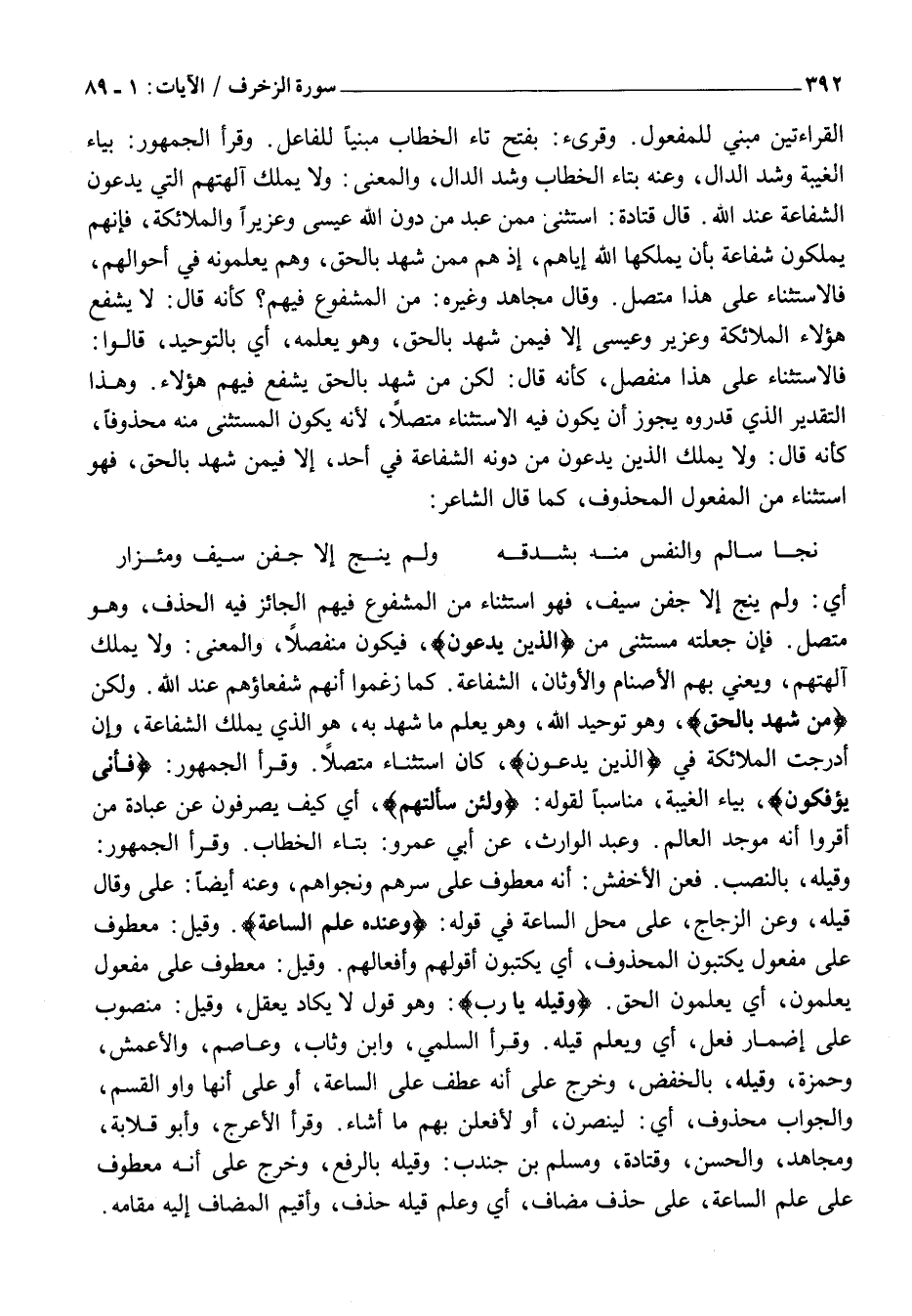 فَالِاسْتِثْنَاءُ عَلَى هَذَا مُنْفَصِلٌ، كَأَنَّهُ قَالَ: لَكِنَّ مَنْ شَهِدَ بِالْحَقِّ يَشْفَعُ فِيهِمْ هَؤُلَاءِ. وَهَذَا التَّقْدِيرُ الَّذِي قَدَّرُوهُ يَجُوزُ أَنْ يَكُونَ فِيهِ الِاسْتِثْنَاءُ مُتَّصِلًا، لِأَنَّهُ يَكُونُ الْمُسْتَثْنَى مِنْهُ مَحْذُوفًا، كَأَنَّهُ قَالَ: وَلَا يَمْلِكُ الَّذِينَ يَدْعُونَ مِنْ دُونِهِ الشَّفَاعَةَ فِي أَحَدٍ، إِلَّا فِيمَنْ شَهِدَ بِالْحَقِّ، فَهُوَ اسْتِثْنَاءٌ مِنَ الْمَفْعُولِ الْمَحْذُوفِ، كَمَا قَالَ الشَّاعِرُ: