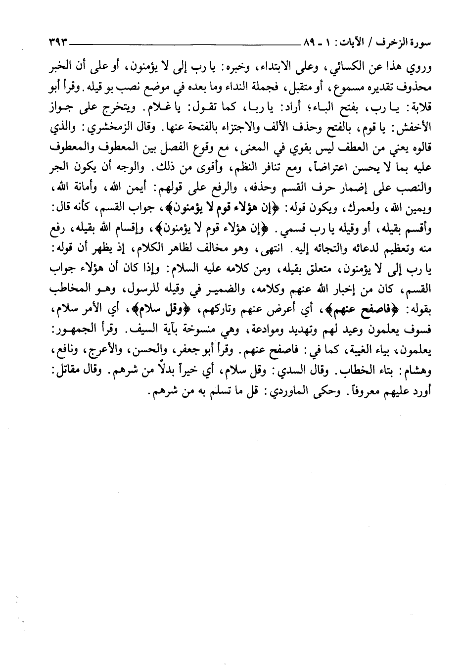 وَأَقْسَمَ بِقِيلِهِ، أَوْ وَقِيلِهِ يَا رَبِّ قَسَمِي. إِنَّ هؤُلاءِ قَوْمٌ لَا يُؤْمِنُونَ، وَإِقْسَامُ اللَّهِ بِقِيلِهِ، رَفْعٌ مِنْهُ وَتَعْظِيمٌ لِدُعَائِهِ وَالْتِجَائِهِ إِلَيْهِ. انْتَهَى، وَهُوَ مُخَالِفٌ لِظَاهِرِ الْكَلَامِ، إِذْ يَظْهَرُ أَنَّ قَوْلَهُ: