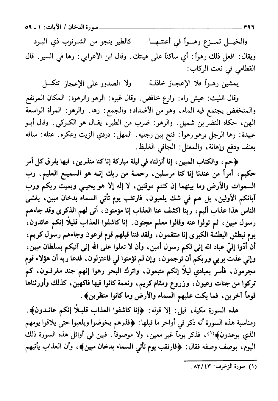 حم، وَالْكِتابِ الْمُبِينِ، إِنَّا أَنْزَلْناهُ فِي لَيْلَةٍ مُبارَكَةٍ إِنَّا كُنَّا مُنْذِرِينَ، فِيها يُفْرَقُ كُلُّ أَمْرٍ حَكِيمٍ، أَمْراً مِنْ عِنْدِنا إِنَّا كُنَّا مُرْسِلِينَ، رَحْمَةً مِنْ رَبِّكَ إِنَّهُ هُوَ السَّمِيعُ الْعَلِيمُ، رَبِّ السَّماواتِ وَالْأَرْضِ وَما بَيْنَهُما إِنْ كُنْتُمْ مُوقِنِينَ، لَا إِلهَ إِلَّا هُوَ يُحْيِي وَيُمِيتُ رَبُّكُمْ وَرَبُّ آبائِكُمُ الْأَوَّلِينَ، بَلْ هُمْ فِي شَكٍّ يَلْعَبُونَ، فَارْتَقِبْ يَوْمَ تَأْتِي السَّماءُ بِدُخانٍ مُبِينٍ، يَغْشَى النَّاسَ هَذَا عَذابٌ أَلِيمٌ، رَبَّنَا اكْشِفْ عَنَّا الْعَذابَ إِنَّا مُؤْمِنُونَ، أَنَّى لَهُمُ الذِّكْرى وَقَدْ جاءَهُمْ رَسُولٌ مُبِينٌ، ثُمَّ تَوَلَّوْا عَنْهُ وَقالُوا مُعَلَّمٌ مَجْنُونٌ. إِنَّا كاشِفُوا الْعَذابِ قَلِيلًا إِنَّكُمْ عائِدُونَ، يَوْمَ نَبْطِشُ الْبَطْشَةَ الْكُبْرى إِنَّا مُنْتَقِمُونَ، وَلَقَدْ فَتَنَّا قَبْلَهُمْ قَوْمَ فِرْعَوْنَ وَجاءَهُمْ رَسُولٌ كَرِيمٌ، أَنْ أَدُّوا إِلَيَّ عِبادَ اللَّهِ إِنِّي لَكُمْ رَسُولٌ أَمِينٌ، وَأَنْ لَا تَعْلُوا عَلَى اللَّهِ إِنِّي آتِيكُمْ بِسُلْطانٍ مُبِينٍ، وَإِنِّي عُذْتُ بِرَبِّي وَرَبِّكُمْ أَنْ تَرْجُمُونِ، وَإِنْ لَمْ تُؤْمِنُوا لِي فَاعْتَزِلُونِ، فَدَعا رَبَّهُ أَنَّ هؤُلاءِ قَوْمٌ مُجْرِمُونَ، فَأَسْرِ بِعِبادِي لَيْلًا إِنَّكُمْ مُتَّبَعُونَ، وَاتْرُكِ الْبَحْرَ رَهْواً إِنَّهُمْ جُنْدٌ مُغْرَقُونَ، كَمْ تَرَكُوا مِنْ جَنَّاتٍ وَعُيُونٍ، وَزُرُوعٍ وَمَقامٍ كَرِيمٍ، وَنَعْمَةٍ كانُوا فِيها فاكِهِينَ، كَذلِكَ وَأَوْرَثْناها قَوْماً آخَرِينَ، فَما بَكَتْ عَلَيْهِمُ السَّماءُ وَالْأَرْضُ وَما كانُوا مُنْظَرِينَ.