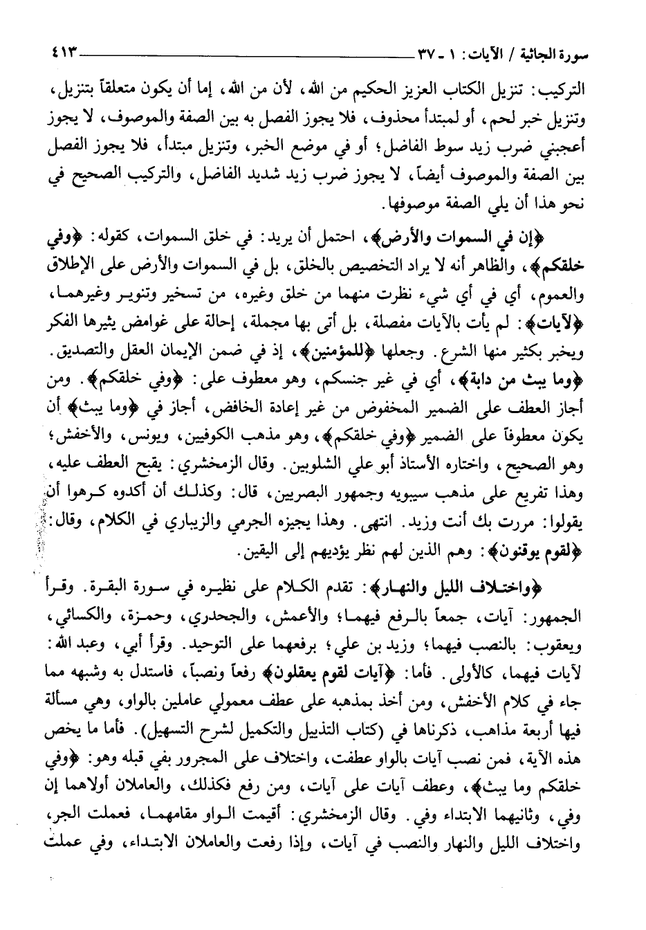 لَآيَاتٍ فِيهِمَا، كَالْأُولَى. فَأَمَّا: آياتٌ لِقَوْمٍ يَعْقِلُونَ رَفْعًا وَنَصْبًا، فَاسْتَدَلَّ بِهِ وَشِبْهِهِ مِمَّا جَاءَ فِي كَلَامِ الْأَخْفَشِ، وَمَنْ أَخَذَ بِمَذْهَبِهِ عَلَى عَطْفِ مَعْمُولَيْ عَامِلَيْنِ بِالْوَاوِ، وَهِيَ مَسْأَلَةٌ فِيهَا أَرْبَعَةُ مَذَاهِبَ، ذَكَرْنَاهَا فِي (كِتَابِ التَّذْيِيلِ وَالتَّكْمِيلِ لِشَرْحِ التَّسْهِيلِ) . فَأَمَّا مَا يَخُصُّ هَذِهِ الْآيَةَ، فَمَنْ نصب آيات بالواو عطفت، وَاخْتِلَافِ عَلَى الْمَجْرُورِ بِفِي قَبْلَهُ وَهُوَ: وَفِي خَلْقِكُمْ وَما يَبُثُّ، وَعَطَفَ آيَاتٍ عَلَى آيَاتٍ، وَمَنْ رَفَعَ فَكَذَلِكَ، وَالْعَامِلَانِ أُولَاهُمَا إِنَّ وَفِي، وَثَانِيهِمَا الِابْتِدَاءُ وَفِي. وَقَالَ الزَّمَخْشَرِيُّ: أُقِيمَتِ الْوَاوُ مَقَامَهُمَا، فَعَمِلَتِ الْجَرَّ، وَاخْتِلَافِ اللَّيْلِ وَالنَّهَارِ وَالنَّصْبَ فِي آيَاتٍ، وَإِذَا رُفِعَتْ وَالْعَامِلَانِ الِابْتِدَاءُ، وَفِي عَمِلَتِ