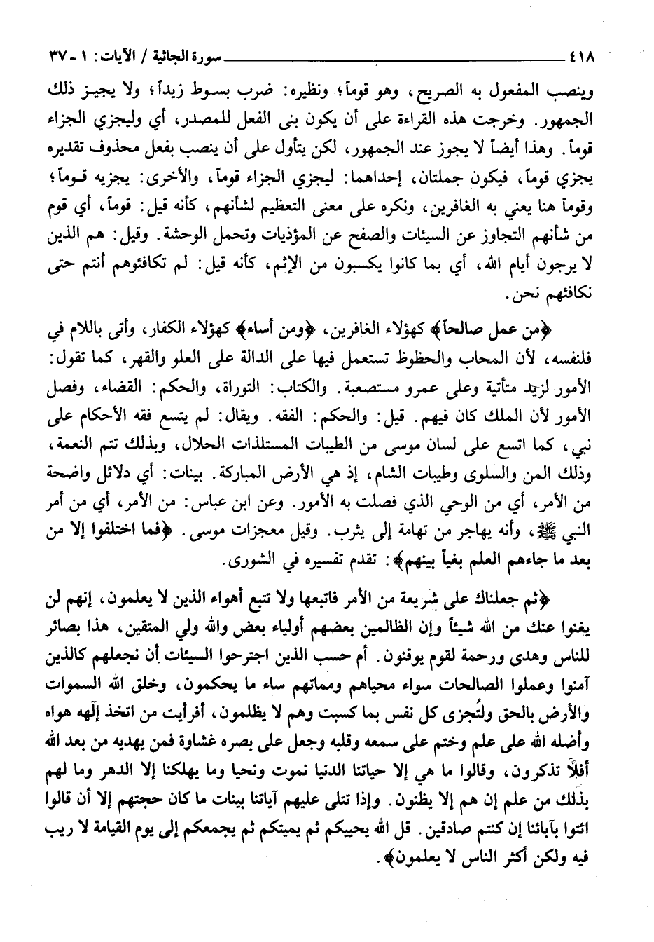 ثُمَّ جَعَلْناكَ عَلى شَرِيعَةٍ مِنَ الْأَمْرِ فَاتَّبِعْها وَلا تَتَّبِعْ أَهْواءَ الَّذِينَ لَا يَعْلَمُونَ، إِنَّهُمْ لَنْ يُغْنُوا عَنْكَ مِنَ اللَّهِ شَيْئاً وَإِنَّ الظَّالِمِينَ بَعْضُهُمْ أَوْلِياءُ بَعْضٍ وَاللَّهُ وَلِيُّ الْمُتَّقِينَ، هَذَا بَصائِرُ لِلنَّاسِ وَهُدىً وَرَحْمَةٌ لِقَوْمٍ يُوقِنُونَ. أَمْ حَسِبَ الَّذِينَ اجْتَرَحُوا السَّيِّئاتِ أَنْ نَجْعَلَهُمْ كَالَّذِينَ آمَنُوا وَعَمِلُوا الصَّالِحاتِ سَواءً مَحْياهُمْ وَمَماتُهُمْ ساءَ مَا يَحْكُمُونَ، وَخَلَقَ اللَّهُ السَّماواتِ وَالْأَرْضَ بِالْحَقِّ وَلِتُجْزى كُلُّ نَفْسٍ بِما كَسَبَتْ وَهُمْ لَا يُظْلَمُونَ، أَفَرَأَيْتَ مَنِ اتَّخَذَ إِلهَهُ هَواهُ وَأَضَلَّهُ اللَّهُ عَلى عِلْمٍ وَخَتَمَ عَلى سَمْعِهِ وَقَلْبِهِ وَجَعَلَ عَلى بَصَرِهِ غِشاوَةً فَمَنْ يَهْدِيهِ مِنْ بَعْدِ اللَّهِ أَفَلا تَذَكَّرُونَ، وَقالُوا مَا هِيَ إِلَّا حَياتُنَا الدُّنْيا نَمُوتُ وَنَحْيا وَما يُهْلِكُنا إِلَّا الدَّهْرُ وَما لَهُمْ بِذلِكَ مِنْ عِلْمٍ إِنْ هُمْ إِلَّا يَظُنُّونَ. وَإِذا تُتْلى عَلَيْهِمْ آياتُنا بَيِّناتٍ مَا كانَ حُجَّتَهُمْ إِلَّا أَنْ قالُوا ائْتُوا بِآبائِنا إِنْ كُنْتُمْ صادِقِينَ. قُلِ اللَّهُ يُحْيِيكُمْ ثُمَّ يُمِيتُكُمْ ثُمَّ يَجْمَعُكُمْ إِلى يَوْمِ الْقِيامَةِ لَا رَيْبَ فِيهِ وَلكِنَّ أَكْثَرَ النَّاسِ لَا يَعْلَمُونَ.
