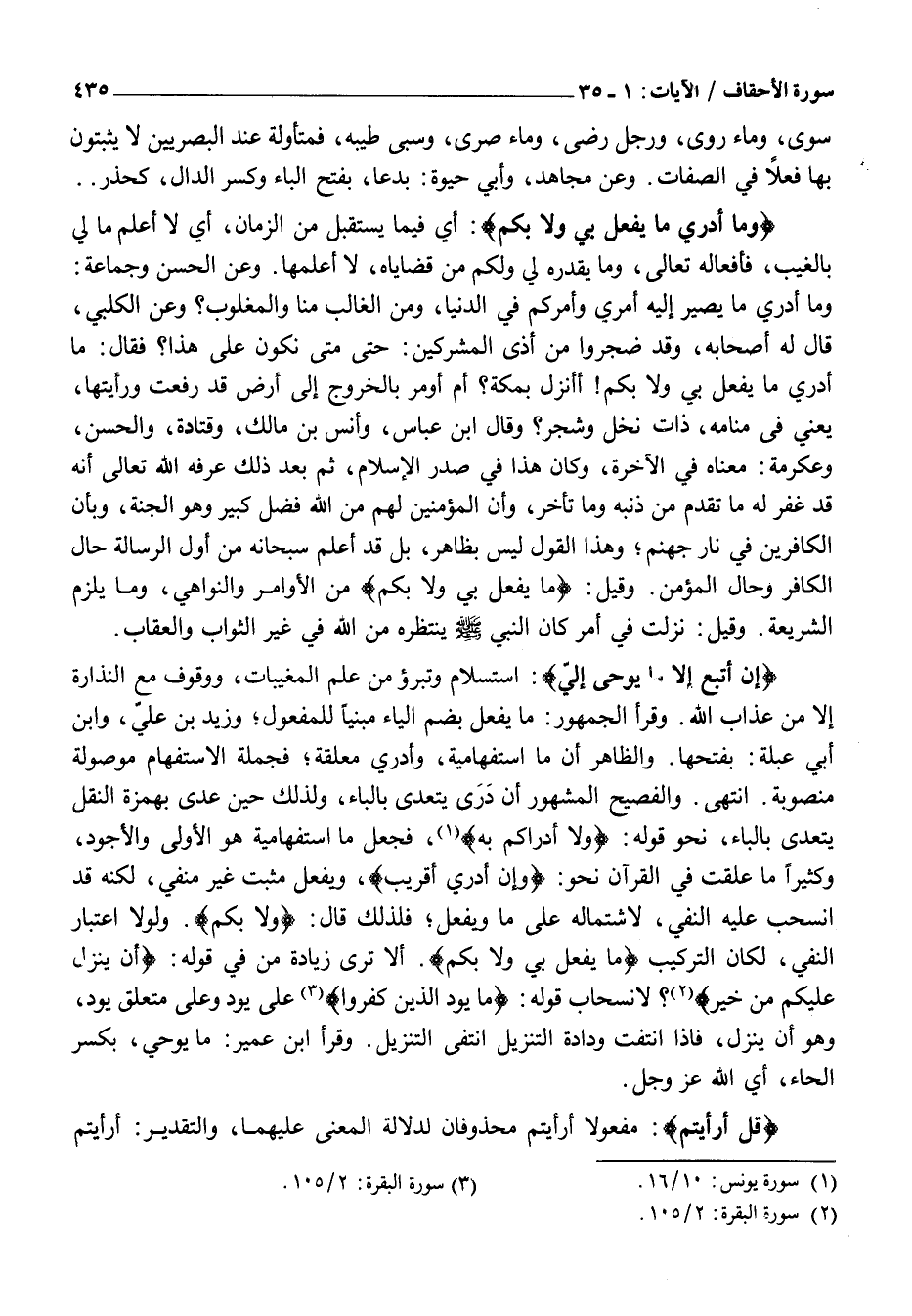 إِنْ أَتَّبِعُ إِلَّا مَا يُوحى إِلَيَّ: اسْتِسْلَامٌ وَتَبَرُّؤٌ مِنْ عِلْمِ الْمُغَيَّبَاتِ، وَوُقُوفٌ مَعَ النِّذَارَةِ إِلَّا مِنْ عَذَابِ اللَّهِ. وَقَرَأَ الْجُمْهُورُ: مَا يُفْعَلُ بِضَمِّ الْيَاءِ مَبْنِيًّا لِلْمَفْعُولِ وَزَيْدُ بْنُ عَلِيٍّ، وَابْنُ أَبِي عَبْلَةَ: بِفَتْحِهَا. وَالظَّاهِرُ أَنَّ مَا اسْتِفْهَامِيَّةٌ، وَأَدْرِي مُعَلَّقَةٌ فَجُمْلَةُ الِاسْتِفْهَامِ مَوْصُولَةٌ مَنْصُوبَةٌ. انْتَهَى. وَالْفَصِيحُ الْمَشْهُورُ أَنَّ دَرَى يَتَعَدَّى بِالْبَاءِ، وَلِذَلِكَ حِينَ عُدِّيَ بِهَمْزَةِ النَّقْلِ يَتَعَدَّى بِالْبَاءِ، نَحْوُ قَوْلِهِ: وَلا أَدْراكُمْ بِهِ «1» ، فَجَعْلُ مَا اسْتِفْهَامِيَّةً هُوَ الْأَوْلَى وَالْأَجْوَدُ، وَكَثِيرًا مَا عُلِّقَتْ فِي الْقُرْآنِ نَحْوُ: وَإِنْ أَدْرِي أَقَرِيبٌ، ويفعل مُثْبَتٌ غَيْرُ مَنْفِيٍّ، لَكِنَّهُ قَدِ انْسَحَبَ عَلَيْهِ النَّفْيُ، لاشتماله على ما ويفعل فَلِذَلِكَ قَالَ: وَلا بِكُمْ. وَلَوْلَا اعْتِبَارُ النَّفْيِ، لَكَانَ التَّرْكِيبُ مَا يُفْعَلُ بِي وَلا بِكُمْ. أَلَا تَرَى زِيَادَةَ مِنْ فِي قَوْلِهِ: أَنْ يُنَزَّلَ عَلَيْكُمْ مِنْ خَيْرٍ «2» ؟ لا نسحاب قَوْلِهِ: مَا يَوَدُّ الَّذِينَ كَفَرُوا «3» عَلَى يَوَدُّ وَعَلَى مُتَعَلِّقِ يَوَدُّ، وَهُوَ أَنْ يُنَزَّلَ، فَإِذَا انْتَفَتْ وِدَادَةُ التَّنْزِيلِ انْتَفَى التَّنْزِيلُ. وَقَرَأَ ابْنُ عُمَيْرٍ: مَا يُوحِي، بِكَسْرِ الْحَاءِ، أَيِ اللَّهُ عَزَّ وَجَلَّ.