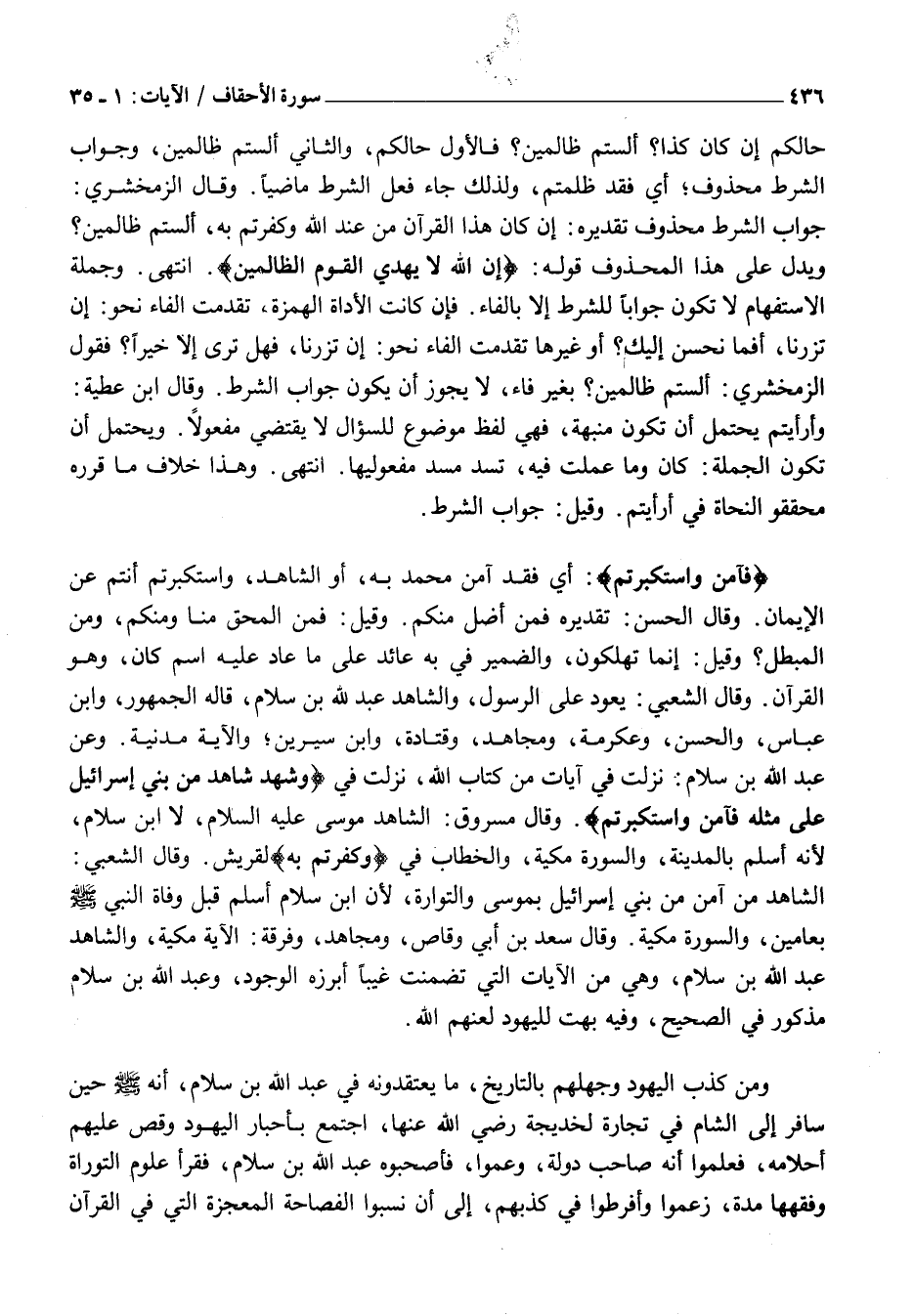 فَآمَنَ وَاسْتَكْبَرْتُمْ: أَيْ فَقَدْ آمَنَ مُحَمَّدٌ بِهِ، أَوِ الشَّاهِدُ، وَاسْتَكْبَرْتُمْ أَنْتُمْ عَنِ الْإِيمَانِ. وَقَالَ الْحَسَنُ: تَقْدِيرُهُ فَمَنْ أَضَلُّ مِنْكُمْ. وَقِيلَ: فَمَنِ الْمُحِقُّ مِنَّا وَمِنْكُمْ، وَمَنِ الْمُبْطِلُ؟ وَقِيلَ: إِنَّمَا تَهْلِكُونَ، وَالضَّمِيرُ فِي بِهِ عَائِدٌ عَلَى مَا عَادَ عَلَيْهِ اسْمُ كَانَ، وَهُوَ الْقُرْآنُ. وَقَالَ الشَّعْبِيُّ: يَعُودُ عَلَى الرَّسُولِ، وَالشَّاهِدُ عَبَدُ لله بْنُ سَلَامٍ، قَالَهُ الْجُمْهُورُ، وَابْنُ عَبَّاسٍ، وَالْحَسَنُ، وَعِكْرِمَةُ، وَمُجَاهِدٌ، وَقَتَادَةُ، وَابْنُ سِيرِينَ وَالْآيَةُ مَدَنِيَّةٌ. وَعَنْ عَبْدِ اللَّهِ بْنِ سَلَامٍ: نَزَلَتْ فِيَّ آيَاتٌ مِنْ كِتَابِ اللَّهِ، نَزَلَتْ فِيَّ وَشَهِدَ شاهِدٌ مِنْ بَنِي إِسْرائِيلَ عَلى مِثْلِهِ فَآمَنَ وَاسْتَكْبَرْتُمْ. وَقَالَ مَسْرُوقٌ: الشَّاهِدُ مُوسَى عَلَيْهِ السَّلَامُ، لَا ابْنُ سَلَامٍ، لِأَنَّهُ أَسْلَمَ بِالْمَدِينَةِ، وَالسُّورَةُ مَكِّيَّةٌ، وَالْخِطَابُ فِي وَكَفَرْتُمْ بِهِ لِقُرَيْشٍ. وَقَالَ الشَّعْبِيُّ: