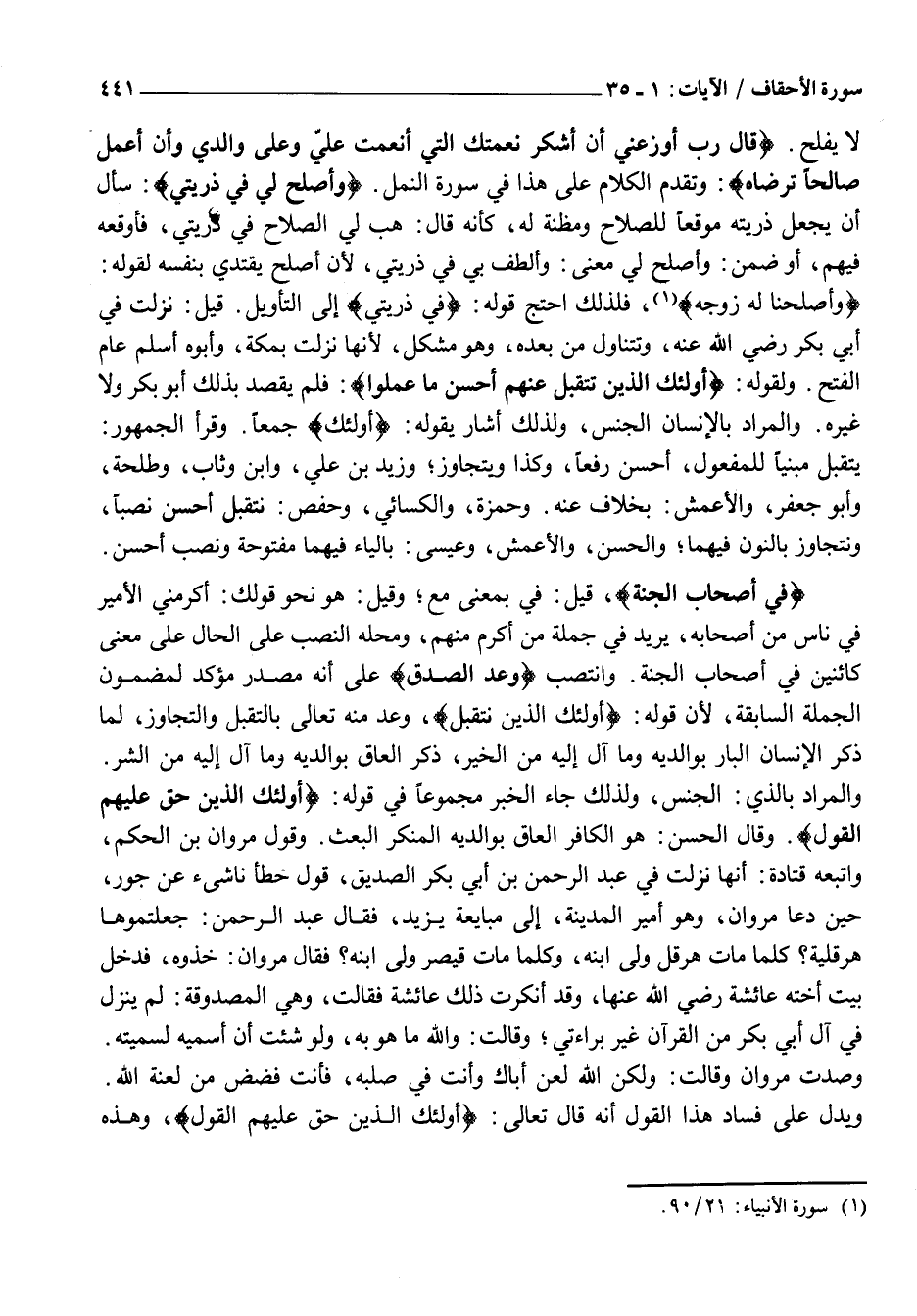 قالَ رَبِّ أَوْزِعْنِي أَنْ أَشْكُرَ نِعْمَتَكَ الَّتِي أَنْعَمْتَ عَلَيَّ وَعَلى والِدَيَّ وَأَنْ أَعْمَلَ صالِحاً تَرْضاهُ: وَتَقَدَّمَ الْكَلَامُ عَلَى هَذَا فِي سُورَةِ النَّمْلِ. وَأَصْلِحْ لِي فِي ذُرِّيَّتِي: سَأَلَ أَنْ يَجْعَلَ ذُرِّيَّتَهُ مَوْقِعًا لِلصَّلَاحِ وَمَظِنَّةً لَهُ، كَأَنَّهُ قَالَ: هَبْ لِيَ الصَّلَاحَ فِي ذُرِّيَّتِي، فَأَوْقَعَهُ فِيهِمْ، أَوْ ضَمَّنَ: وَأَصْلِحْ لِي مَعْنَى: وَالْطُفْ بِي فِي ذُرِّيَّتِي، لِأَنَّ أَصْلِحْ يَقْتَدِي بِنَفْسِهِ لِقَوْلِهِ: