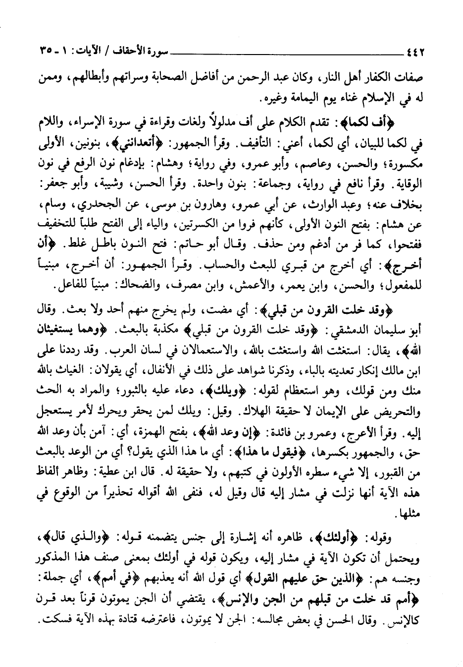 أُفٍّ لَكُما: تَقَدَّمَ الْكَلَامُ عَلَى أُفٍّ مَدْلُولًا وَلُغَاتٍ وَقِرَاءَةً فِي سُورَةِ الْإِسْرَاءِ، وَاللَّامُ فِي لَكُمَا لِلْبَيَانِ، أَيْ لَكُمَا، أَعْنِي: التَّأْفِيفَ. وَقَرَأَ الْجُمْهُورُ: أَتَعِدانِنِي، بِنُونَيْنِ، الْأُولَى مَكْسُورَةٌ وَالْحَسَنُ، وَعَاصِمٌ، وَأَبُو عَمْرٍو، وَفِي رِوَايَةٍ وَهِشَامٌ: بِإِدْغَامِ نُونِ الرَّفْعِ فِي نُونِ الْوِقَايَةِ. وَقَرَأَ نَافِعٌ فِي رِوَايَةِ، وَجَمَاعَةٌ: بِنُونٍ وَاحِدَةٍ. وَقَرَأَ الْحَسَنُ، وَشَيْبَةُ، وَأَبُو جَعْفَرٍ: