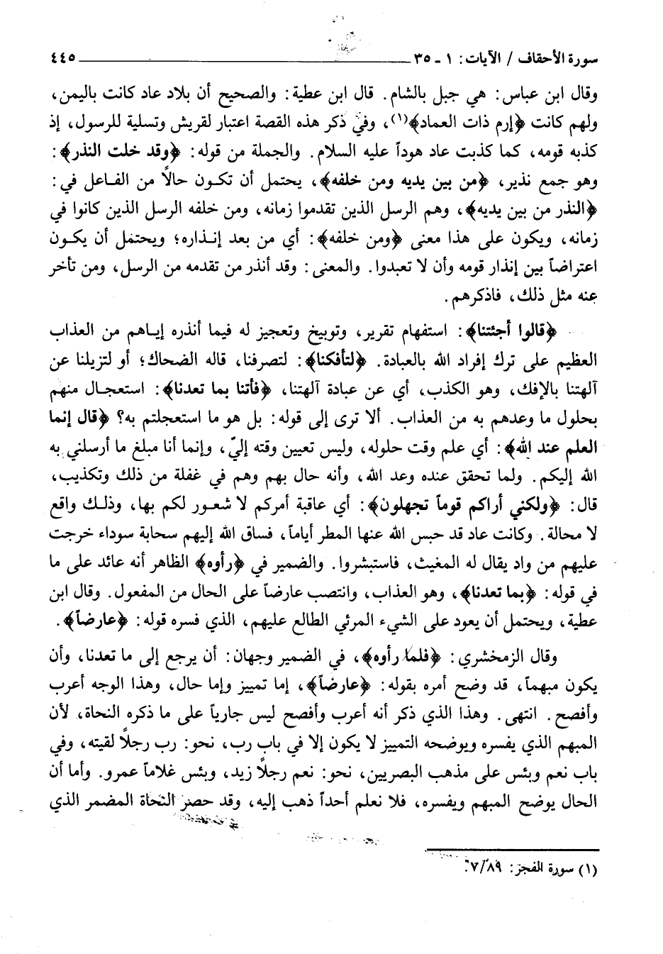 قالُوا أَجِئْتَنا: اسْتِفْهَامُ تَقْرِيرٍ، وَتَوْبِيخٍ وَتَعْجِيزٍ لَهُ فِيمَا أَنْذَرَهُ إِيَّاهُمْ مِنَ الْعَذَابِ الْعَظِيمِ عَلَى تَرْكِ إِفْرَادِ اللَّهِ بِالْعِبَادَةِ. لِتَأْفِكَنا: لِتَصْرِفَنَا، قَالَهُ الضَّحَّاكُ أَوْ لِتُزِيلَنَا عَنْ آلِهَتِنَا بِالْإِفْكِ، وَهُوَ الْكَذِبُ، أَيْ عَنْ عِبَادَةِ آلِهَتِنَا، فَأْتِنا بِما تَعِدُنا: اسْتِعْجَالٌ مِنْهُمْ بِحُلُولِ مَا وَعَدَهُمْ بِهِ مِنَ الْعَذَابِ. أَلَا تَرَى إِلَى قَوْلِهِ: بَلْ هُوَ مَا اسْتَعْجَلْتُمْ بِهِ؟ قالَ إِنَّمَا الْعِلْمُ عِنْدَ اللَّهِ: أَيْ عِلْمُ وَقْتِ حُلُولِهِ، وَلَيْسَ تَعْيِينُ وَقْتِهِ إِلَيَّ، وَإِنَّمَا أَنَا مُبَلِّغٌ مَا أَرْسَلَنِي بِهِ اللَّهُ إِلَيْكُمْ. وَلَمَّا تَحَقَّقَ عِنْدَهُ وَعْدُ اللَّهِ، وَأَنَّهُ حَالٌّ بِهِمْ وَهُمْ فِي غَفْلَةٍ مِنْ ذَلِكَ وَتَكْذِيبٍ، قَالَ: وَلكِنِّي أَراكُمْ قَوْماً تَجْهَلُونَ: أَيْ عَاقِبَةَ أَمْرِكُمْ لَا شُعُورَ لَكُمْ بِهَا، وَذَلِكَ وَاقِعٌ لَا مَحَالَةَ. وَكَانَتْ عَادٌ قَدْ حَبَسَ اللَّهُ عَنْهَا الْمَطَرَ أَيَّامًا، فَسَاقَ اللَّهُ إِلَيْهِمْ سَحَابَةً سَوْدَاءَ خَرَجَتْ عَلَيْهِمْ مِنْ وَادٍ يُقَالُ لَهُ الْمُغِيثُ، فَاسْتَبْشَرُوا. وَالضَّمِيرُ فِي رَأَوْهُ الظَّاهِرُ أَنَّهُ عَائِدٌ عَلَى مَا فِي قَوْلِهِ: بِما تَعِدُنا، وَهُوَ الْعَذَابُ، وَانْتَصَبَ عَارِضًا عَلَى الْحَالِ مِنَ الْمَفْعُولِ. وَقَالَ ابْنُ عَطِيَّةَ، وَيُحْتَمَلُ أَنْ يَعُودَ عَلَى الشَّيْءِ الْمَرْئِيِّ الطَّالِعِ عَلَيْهِمُ، الَّذِي فَسَّرَهُ قَوْلُهُ: عارِضاً.