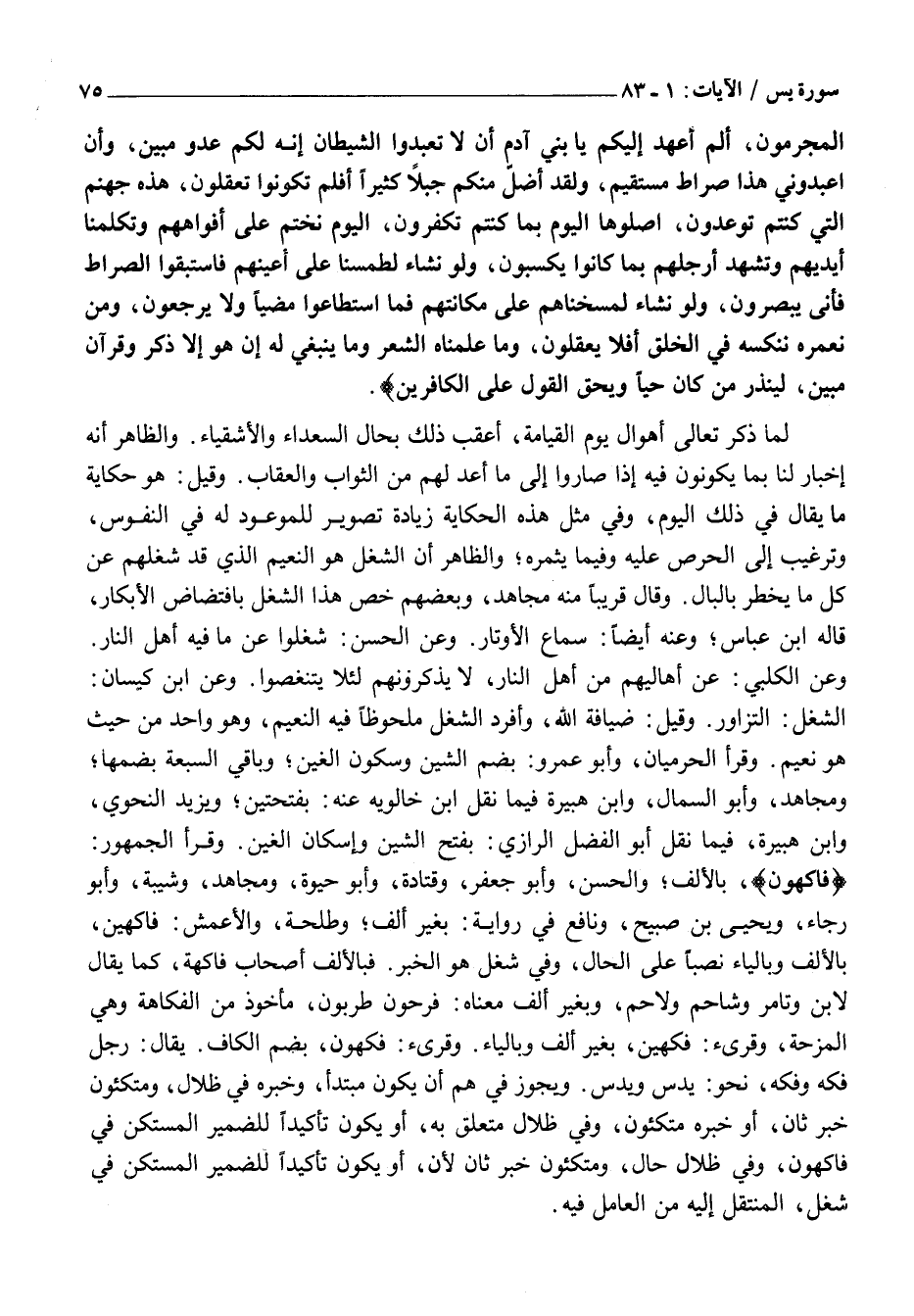 فاكِهُونَ، بِالْأَلِفِ وَالْحَسَنُ، وَأَبُو جَعْفَرٍ، وَقَتَادَةُ، وَأَبُو حَيْوَةَ، وَمُجَاهِدٌ، وَشَيْبَةُ، وَأَبُو رَجَاءٍ، وَيَحْيَى بْنُ صُبَيْحٍ، وَنَافِعٌ فِي رِوَايَةٍ: بِغَيْرِ أَلِفٍ وَطَلْحَةُ، وَالْأَعْمَشُ: فَاكِهِينَ، بِالْأَلِفِ وَبِالْيَاءِ نَصْبًا عَلَى الْحَالِ، وَفِي شُغُلٍ هُوَ الْخَبَرُ. فَبِالْأَلِفِ أَصْحَابُ فَاكِهَةٍ، كَمَا يُقَالُ لَابِنٍ وَتَامِرٍ وَشَاحِمٍ وَلَاحِمٍ، وَبِغَيْرِ أَلِفٍ مَعْنَاهُ: فَرِحُونَ طَرِبُونَ، مَأْخُوذٌ مِنَ الفكاهة وهي المزحة، وقرىء: فَكِهِينَ، بِغَيْرِ أَلِفٍ وَبِالْيَاءِ. وقرىء: فَكُهُونَ، بِضَمِّ الْكَافِ. يُقَالُ: رَجُلٌ فَكُهٌ وَفَكِهٌ، نَحْوُ: يَدُسٌ وَيَدِسٌ. وَيَجُوزُ فِي هُمْ أَنْ يَكُونَ مُبْتَدَأً، وَخَبَرَهُ في ضلال، وَمُتَّكِئُونَ خَبَرٌ ثَانٍ، أَوْ خَبَرُهُ مُتَّكِئُونَ، وَفِي ظِلَالٍ مُتَعَلِّقٌ بِهِ، أَوْ يَكُونَ تَأْكِيدًا لِلضَّمِيرِ الْمُسْتَكِنِّ فِي فَاكِهُونَ، وَفِي ظِلَالٍ حَالٌ، وَمُتَّكِئُونَ خَبَرٌ ثَانٍ لِإِنَّ، أَوْ يَكُونَ تَأْكِيدًا لِلضَّمِيرِ الْمُسْتَكِنِّ فِي شُغُلٍ، الْمُنْتَقِلِ إِلَيْهِ مِنَ الْعَامِلِ فِيهِ.