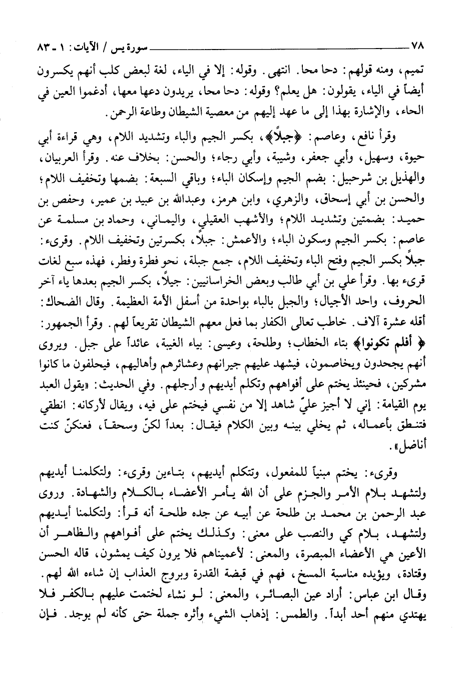 وَقَرَأَ نَافِعٌ، وَعَاصِمٌ: جِبِلًّا، بِكَسْرِ الْجِيمِ وَالْبَاءِ وَتَشْدِيدِ اللَّامِ، وَهِيَ قِرَاءَةُ أَبِي حَيْوَةَ، وَسُهَيْلٍ، وَأَبِي جَعْفَرٍ، وَشَيْبَةَ، وَأَبِي رجاء والحسن: بخلاف عنه. وَقَرَأَ الْعَرَبِيَّانِ، وَالْهُذَيْلُ بْنُ شُرَحْبِيلَ: بِضَمِّ الْجِيمِ وَإِسْكَانِ الْبَاءِ وَبَاقِي السَّبْعَةِ: بِضَمِّهَا وَتَخْفِيفِ اللَّامِ وَالْحَسَنُ بْنُ أَبِي إِسْحَاقَ، وَالزُّهْرِيُّ، وَابْنُ هُرْمُزَ، وَعَبْدُ اللَّهِ بْنُ عُبَيْدِ بْنِ عُمَيْرٍ، وَحَفْصُ بْنُ حُمَيْدٍ: بِضَمَّتَيْنِ وَتَشْدِيدِ اللَّامِ وَالْأَشْهَبُ الْعُقَيْلِيُّ، وَالْيَمَانِيُّ، وَحَمَّادُ بْنُ مَسْلَمَةَ عَنْ عَاصِمٍ: بِكَسْرِ الْجِيمِ وَسُكُونِ الْبَاءِ وَالْأَعْمَشُ: جِبِلًا، بِكَسْرَتَيْنِ وتخفيف اللام. وقرىء:
