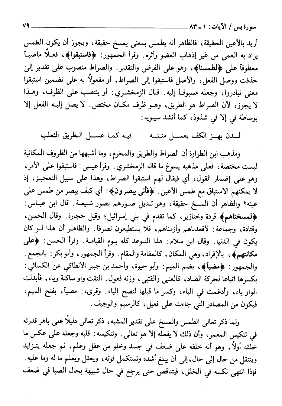 وَمَذْهَبُ ابْنِ الطَّرَاوَةِ أَنَّ الصِّرَاطَ وَالطَّرِيقَ وَالْمَخْرِمَ، وَمَا أَشْبَهَهَا مِنَ الظُّرُوفِ الْمَكَانِيَّةِ لَيْسَتْ مُخْتَصَّةً، فَعَلَى مَذْهَبِهِ يَسُوغُ مَا قَالَهُ الزَّمَخْشَرِيُّ. وَقَرَأَ عِيسَى: فَاسْتَبِقُوا عَلَى الْأَمْرِ، وَهُوَ عَلَى إِضْمَارِ الْقَوْلِ، أَيْ فَيُقَالُ لَهُمُ اسْتَبِقُوا الصِّرَاطَ، وَهَذَا عَلَى سَبِيلِ التَّعْجِيزِ، إِذْ لَا يُمْكِنُهُمُ الِاسْتِبَاقُ مَعَ طَمْسِ الْأَعْيُنِ. فَأَنَّى يُبْصِرُونَ: أَيْ كَيْفَ يُبْصِرُ مَنْ طُمِسَ عَلَى عَيْنِهِ؟ وَالظَّاهِرُ أَنَّ الْمَسْخَ حَقِيقَةٌ، وَهُوَ تَبْدِيلُ صِوَرِهِمْ بِصُوَرٍ شَنِيعَةٍ. قَالَ ابْنُ عَبَّاسٍ: