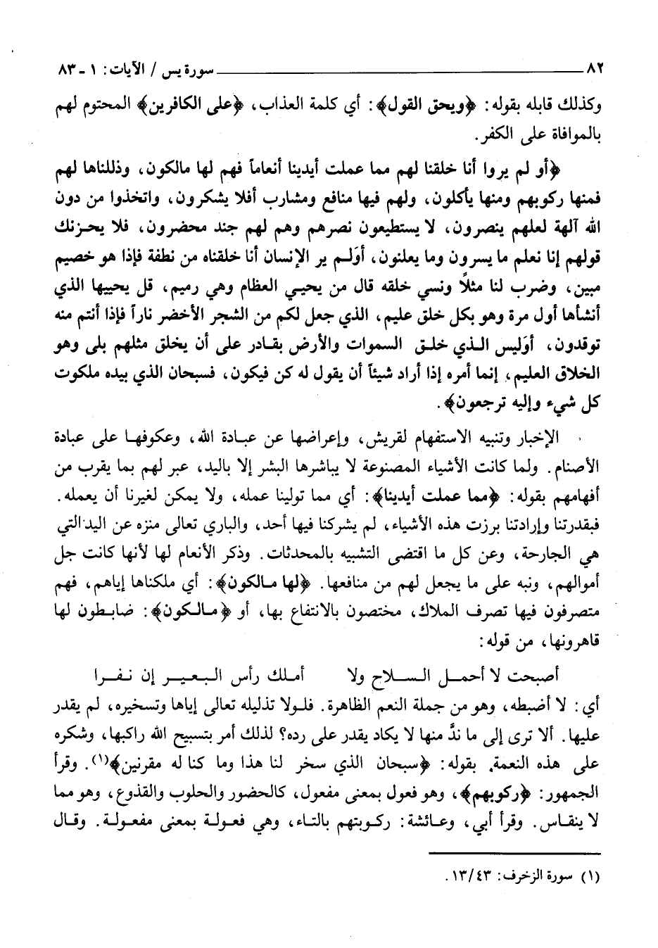 أَوَلَمْ يَرَوْا أَنَّا خَلَقْنا لَهُمْ مِمَّا عَمِلَتْ أَيْدِينا أَنْعاماً فَهُمْ لَها مالِكُونَ، وَذَلَّلْناها لَهُمْ فَمِنْها رَكُوبُهُمْ وَمِنْها يَأْكُلُونَ، وَلَهُمْ فِيها مَنافِعُ وَمَشارِبُ أَفَلا يَشْكُرُونَ، وَاتَّخَذُوا مِنْ دُونِ اللَّهِ آلِهَةً لَعَلَّهُمْ يُنْصَرُونَ، لَا يَسْتَطِيعُونَ نَصْرَهُمْ وَهُمْ لَهُمْ جُنْدٌ مُحْضَرُونَ، فَلا يَحْزُنْكَ قَوْلُهُمْ إِنَّا نَعْلَمُ مَا يُسِرُّونَ وَما يُعْلِنُونَ، أَوَلَمْ يَرَ الْإِنْسانُ أَنَّا خَلَقْناهُ مِنْ نُطْفَةٍ فَإِذا هُوَ خَصِيمٌ مُبِينٌ، وَضَرَبَ لَنا مَثَلًا وَنَسِيَ خَلْقَهُ قالَ مَنْ يُحْيِ الْعِظامَ وَهِيَ رَمِيمٌ، قُلْ يُحْيِيهَا الَّذِي أَنْشَأَها أَوَّلَ مَرَّةٍ وَهُوَ بِكُلِّ خَلْقٍ عَلِيمٌ، الَّذِي جَعَلَ لَكُمْ مِنَ الشَّجَرِ الْأَخْضَرِ نَارًا فَإِذا أَنْتُمْ مِنْهُ تُوقِدُونَ، أَوَلَيْسَ الَّذِي خَلَقَ السَّماواتِ وَالْأَرْضَ بِقادِرٍ عَلى أَنْ يَخْلُقَ مِثْلَهُمْ بَلى وَهُوَ الْخَلَّاقُ الْعَلِيمُ، إِنَّما أَمْرُهُ إِذا أَرادَ شَيْئاً أَنْ يَقُولَ لَهُ كُنْ فَيَكُونُ، فَسُبْحانَ الَّذِي بِيَدِهِ مَلَكُوتُ كُلِّ شَيْءٍ وَإِلَيْهِ تُرْجَعُونَ.