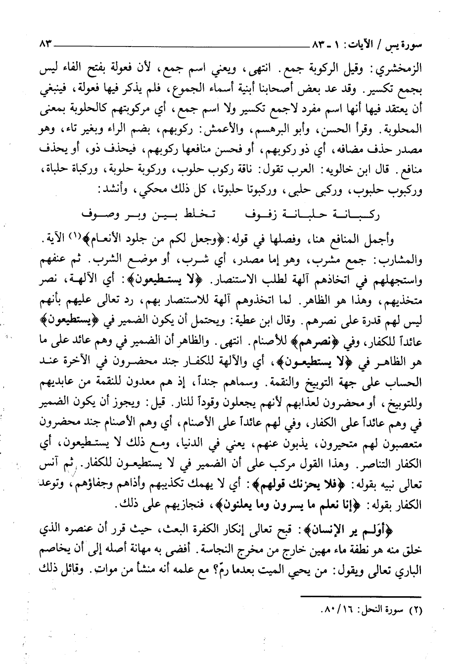 وَالْمَشَارِبُ: جَمْعُ مَشْرَبٍ، وَهُوَ إِمَّا مَصْدَرٌ، أَيْ شُرْبٌ، أَوْ مَوْضِعُ الشُّرْبِ. ثُمَّ عَنَّفَهُمْ وَاسْتَجْهَلَهُمْ فِي اتِّخَاذِهِمْ آلِهَةً لِطَلَبِ الِاسْتِنْصَارِ. لَا يَسْتَطِيعُونَ: أَيِ الْآلِهَةُ، نَصْرَ مُتَّخِذِيهِمْ، وَهَذَا هُوَ الظَّاهِرُ. لَمَّا اتَّخَذُوهُمْ آلِهَةً لِلِاسْتِنْصَارِ بِهِمْ، رَدَّ تَعَالَى عَلَيْهِمْ بِأَنَّهُمْ لَيْسَ لَهُمْ قُدْرَةٌ عَلَى نَصْرِهِمْ. وَقَالَ ابْنُ عَطِيَّةَ: وَيُحْتَمَلُ أَنْ يَكُونَ الضَّمِيرُ فِي يَسْتَطِيعُونَ عائدا لِلْكُفَّارِ، وَفِي نَصْرَهُمْ لِلْأَصْنَامِ. انْتَهَى. وَالظَّاهِرُ أَنَّ الضَّمِيرَ فِي وَهُمْ عَائِدٌ عَلَى مَا هُوَ الظَّاهِرُ فِي لَا يَسْتَطِيعُونَ، أَيْ وَالْآلِهَةُ لِلْكُفَّارِ جُنْدٌ مُحْضَرُونَ فِي الْآخِرَةِ عِنْدَ الْحِسَابِ عَلَى جِهَةِ التَّوْبِيخِ وَالنِّقْمَةِ. وَسَمَّاهُمْ جُنْدًا، إِذْ هُمْ مُعَدُّونَ لِلنِّقْمَةِ مِنْ عَابِدِيهِمْ وَلِلتَّوْبِيخِ، أَوْ مُحْضَرُونَ لِعَذَابِهِمْ لِأَنَّهُمْ يُجْعَلُونَ وَقُودًا لِلنَّارِ. قِيلَ: وَيَجُوزُ أَنْ يَكُونَ الضَّمِيرُ فِي وَهُمْ عَائِدًا عَلَى الْكُفَّارِ، وَفِي لَهُمْ عَائِدًا عَلَى الْأَصْنَامِ، أَيْ وَهُمُ الْأَصْنَامُ جُنْدٌ مُحْضَرُونَ مُتَعَصِّبُونَ لَهُمْ مُتَحَيِّرُونَ، يَذُبُّونَ عَنْهُمْ، يَعْنِي فِي الدُّنْيَا، وَمَعَ ذَلِكَ لَا يَسْتَطِيعُونَ، أَيِ الْكُفَّارُ التَّنَاصُرَ. وَهَذَا الْقَوْلُ مُرَكَّبٌ عَلَى أَنَّ الضَّمِيرَ فِي لَا يَسْتَطِيعُونَ لِلْكُفَّارِ. ثُمَّ آنَسَ تَعَالَى نَبِيَّهُ بِقَوْلِهِ: فَلا يَحْزُنْكَ قَوْلُهُمْ: أَيْ لَا يَهُمُّكَ تَكْذِيبُهُمْ وَأَذَاهُمْ وَجَفَاؤُهُمْ، وَتَوَعَّدَ الْكُفَّارَ بِقَوْلِهِ: إِنَّا نَعْلَمُ مَا يُسِرُّونَ وَما يُعْلِنُونَ، فَنُجَازِيهِمْ عَلَى ذَلِكَ.