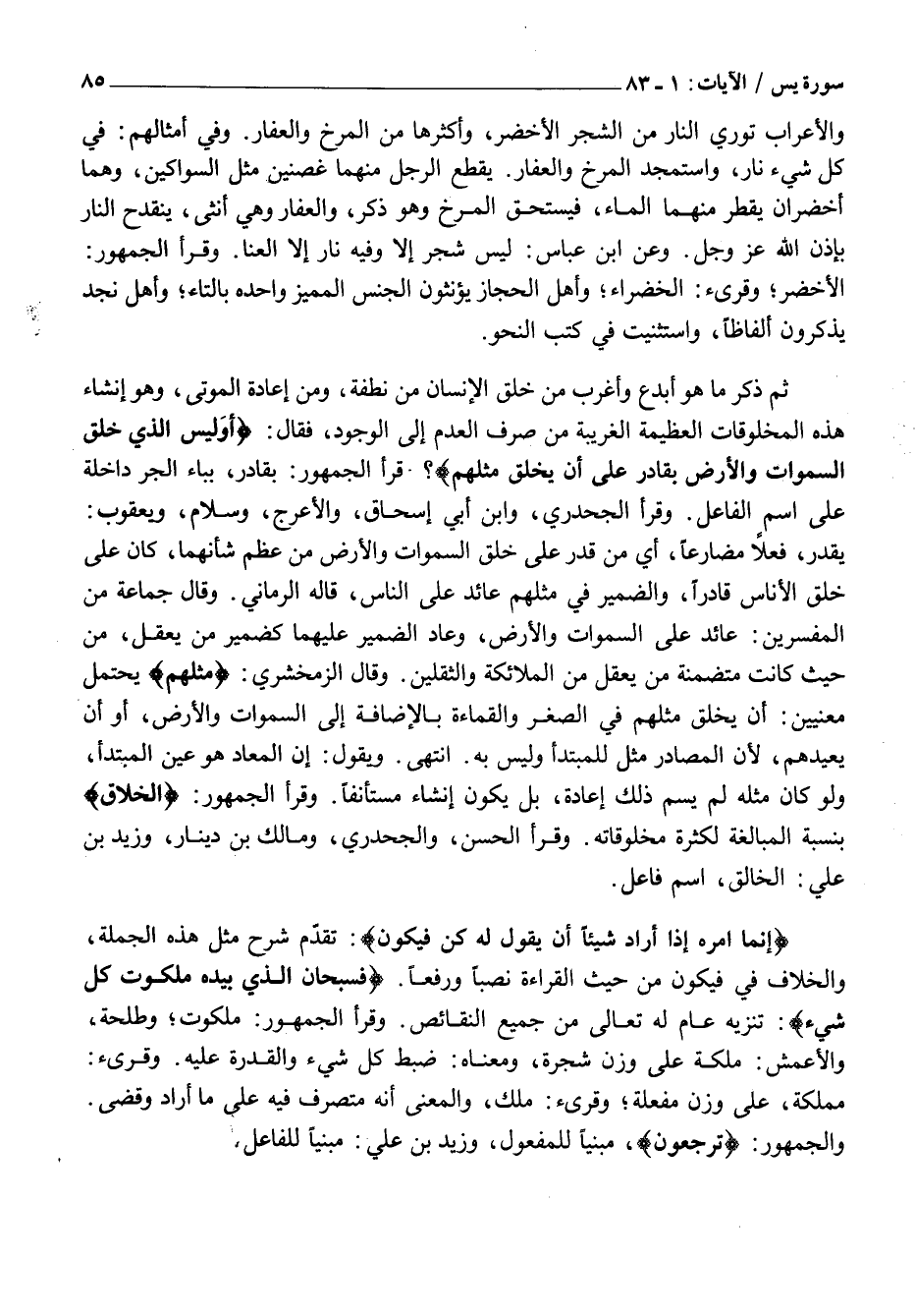 ثُمَّ ذَكَرَ مَا هُوَ أَبْدَعُ وَأَغْرَبُ مِنْ خَلَقَ الْإِنْسَانَ مِنْ نُطْفَةٍ، وَمِنْ إِعَادَةِ الْمَوْتَى، وَهُوَ إِنْشَاءُ هَذِهِ الْمَخْلُوقَاتِ الْعَظِيمَةِ الْغَرِيبَةِ مِنْ صَرْفِ الْعَدَمِ إِلَى الوجود، فقال: أَوَلَيْسَ الَّذِي خَلَقَ السَّماواتِ وَالْأَرْضَ بِقادِرٍ عَلى أَنْ يَخْلُقَ مِثْلَهُمْ؟ قرأ الْجُمْهُورُ: بِقَادِرٍ، بِبَاءِ الْجَرِّ دَاخِلَةٌ عَلَى اسْمِ الْفَاعِلِ. وَقَرَأَ الْجَحْدَرِيُّ، وَابْنُ أَبِي إِسْحَاقَ، وَالْأَعْرَجُ، وَسَلَّامٌ، وَيَعْقُوبُ: