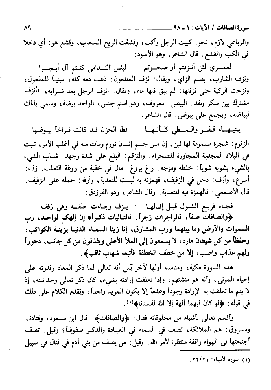 وَأَقْسَمَ تَعَالَى بِأَشْيَاءَ مِنْ مَخْلُوقَاتِهِ فَقَالَ: وَالصَّافَّاتِ. قَالَ ابْنُ مَسْعُودٍ، وَقَتَادَةُ، وَمَسْرُوقٌ: هُمُ الْمَلَائِكَةُ، تُصَفُّ فِي السَّمَاءِ فِي الْعِبَادَةِ وَالذِّكْرِ صُفُوفًا وَقِيلَ: تَصِفُّ أَجْنِحَتَهَا فِي الْهَوَاءِ وَاقِفَةً مُنْتَظِرَةً لِأَمْرِ اللَّهِ. وَقِيلَ: مَنْ يُصَفُّ مِنْ بَنِي آدَمَ فِي قِتَالٍ فِي سَبِيلِ