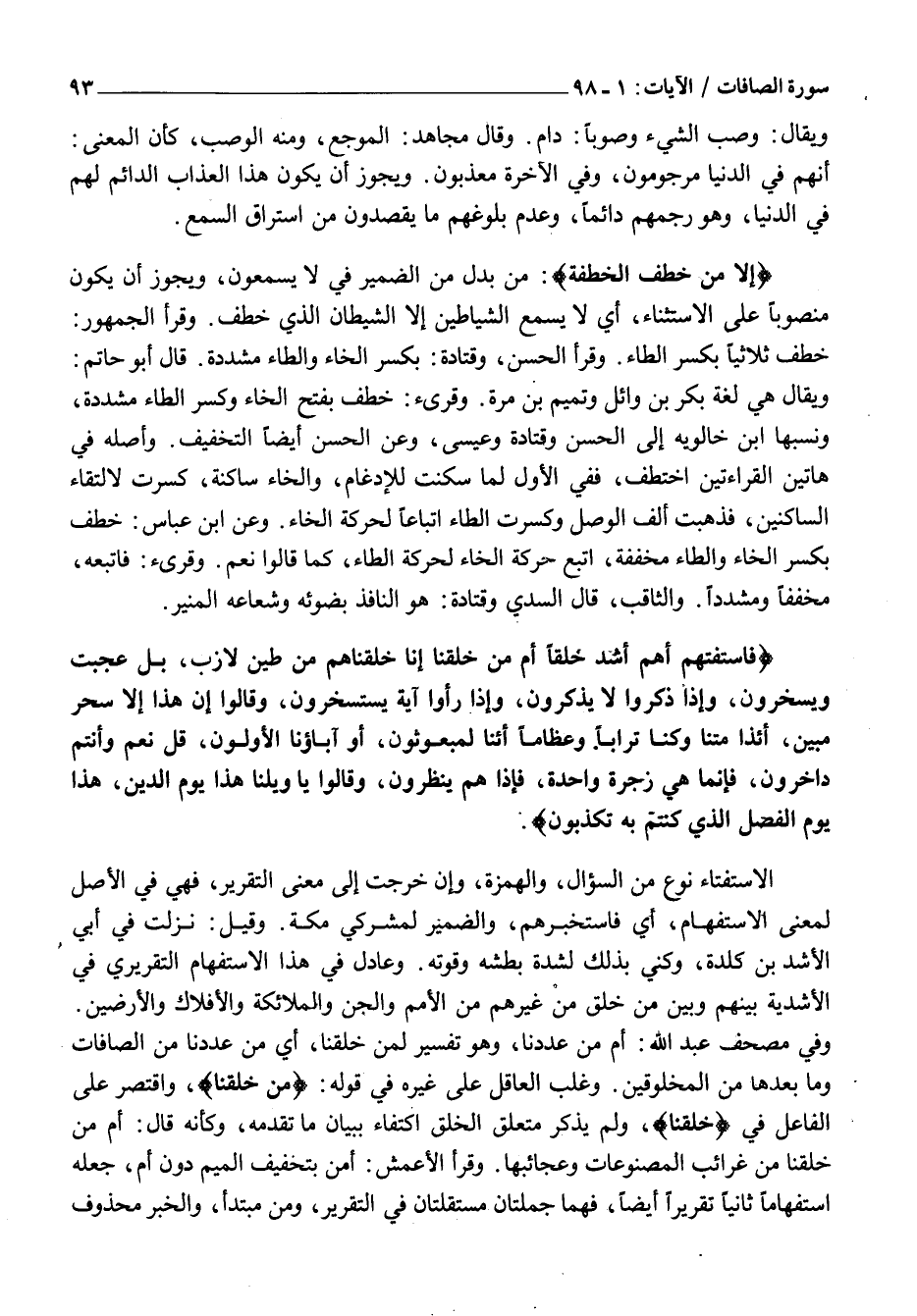 وَيُقَالُ هِيَ لُغَةُ بَكْرِ بْنِ وَائِلٍ وَتَمِيمِ بْنِ مُرَّةَ. وقرىء: خَطِّفَ بِفَتْحِ الْخَاءِ وَكَسْرِ الطَّاءِ مُشَدَّدَةً، وَنَسَبَهَا ابْنُ خَالَوَيْهِ إِلَى الْحَسَنِ وَقَتَادَةَ وَعِيسَى، وَعَنِ الْحَسَنِ أَيْضًا التَّخْفِيفُ. وَأَصْلُهُ فِي هَاتَيْنِ الْقِرَاءَتَيْنِ اخْتَطَفَ، فَفِي الْأَوَّلِ لَمَّا سُكِّنَتْ لِلْإِدْغَامِ، وَالْخَاءُ سَاكِنَةٌ، كُسِرَتْ لِالْتِقَاءِ السَّاكِنَيْنِ، فَذَهَبَتْ أَلِفُ الْوَصْلِ وَكُسِرَتِ الطَّاءُ اتِّبَاعًا لِحَرَكَةِ الْخَاءِ. وَعَنِ ابْنِ عَبَّاسٍ: خِطِفَ بِكَسْرِ الْخَاءِ وَالطَّاءِ مُخَفَّفَةً، اتْبَعَ حَرَكَةَ الْخَاءِ لِحَرَكَةِ الطَّاءِ، كَمَا قَالُوا نِعِمْ. وقرىء: فَأَتْبَعَهُ، مُخَفَّفًا وَمُشَدَّدًا. وَالثَّاقِبُ، قَالَ السُّدِّيُّ وَقَتَادَةُ: هُوَ النَّافِذُ بِضَوْئِهِ وَشُعَاعِهِ الْمُنِيرِ.