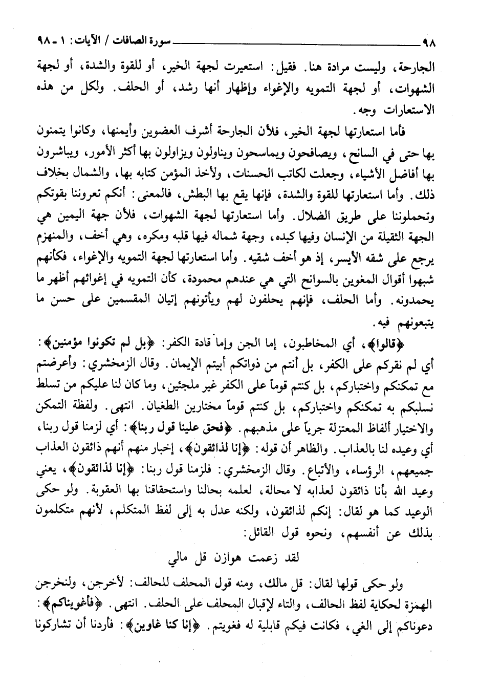 فَأَمَّا اسْتِعَارَتُهَا لِجِهَةِ الْخَيْرِ، فَلِأَنَّ الْجَارِحَةَ أَشْرَفُ الْعُضْوَيْنِ وَأَيْمَنُهَا، وَكَانُوا يَتَمَنَّوْنَ بِهَا حَتَّى فِي السَّانِحِ، وَيُصَافِحُونَ ويماسحون وَيُنَاوِلُونَ وَيُزَاوِلُونَ بِهَا أَكْثَرَ الْأُمُورِ، وَيُبَاشِرُونَ بِهَا أَفَاضِلَ الْأَشْيَاءِ، وَجُعِلَتْ لِكَاتِبِ الْحَسَنَاتِ، وَلِأَخْذِ الْمُؤْمِنِ كِتَابَهُ بِهَا، وَالشِّمَالُ بِخِلَافِ ذَلِكَ. وَأَمَّا اسْتِعَارَتُهَا لِلْقُوَّةِ وَالشِّدَّةِ، فَإِنَّهَا يَقَعُ بِهَا الْبَطْشُ، فَالْمَعْنَى: أَنَّكُمْ تُعَرُّونَنَا بِقُوَّتِكُمْ وَتَحْمِلُونَنَا عَلَى طَرِيقِ الضَّلَالِ. وَأَمَّا اسْتِعَارَتُهَا لِجِهَةِ الشَّهَوَاتِ، فَلِأَنَّ جِهَةَ الْيَمِينِ هِيَ الْجِهَةُ الثَّقِيلَةُ مِنَ الْإِنْسَانِ وَفِيهَا كَبِدُهُ، وَجِهَةُ شِمَالِهِ فِيهَا قَلْبُهُ وَمَكْرُهُ، وَهِيَ أَخَفُّ، وَالْمُنْهَزِمُ يَرْجِعُ عَلَى شِقِّهِ الْأَيْسَرِ، إِذْ هُوَ أَخَفُّ شِقَّيْهِ. وَأَمَّا اسْتِعَارَتُهَا لِجِهَةِ التَّمْوِيهِ وَالْإِغْوَاءِ، فَكَأَنَّهُمْ شَبَّهُوا أَقْوَالَ الْمُغْوِينَ بِالسَّوَانِحِ الَّتِي هِيَ عِنْدَهُمْ مَحْمُودَةٌ، كَأَنَّ التَّمْوِيهَ فِي إِغْوَائِهِمْ أَظْهَرُ مَا يَحْمَدُونَهُ. وَأَمَّا الْحَلِفُ، فَإِنَّهُمْ يَحْلِفُونَ لَهُمْ وَيَأْتُونَهُمْ إِتْيَانَ الْمُقْسِمِينَ عَلَى حُسْنِ مَا يَتْبَعُونَهُمْ فِيهِ.