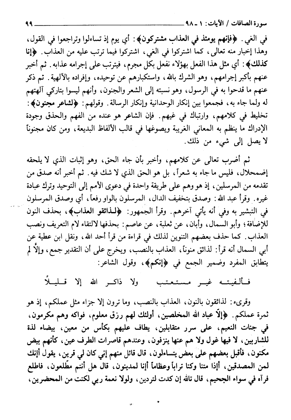 وقرىء: لَذَائِقُونَ بِالنُّونِ، الْعَذَابَ بِالنَّصْبِ، وَمَا تَرَوْنَ إِلَّا جَزَاءً مِثْلَ عَمَلِكُمْ، إِذْ هُوَ ثَمَرَةُ عَمَلِكُمْ. إِلَّا عِبادَ اللَّهِ الْمُخْلَصِينَ، أُولئِكَ لَهُمْ رِزْقٌ مَعْلُومٌ، فَواكِهُ وَهُمْ مُكْرَمُونَ، فِي جَنَّاتِ النَّعِيمِ، عَلى سُرُرٍ مُتَقابِلِينَ، يُطافُ عَلَيْهِمْ بِكَأْسٍ مِنْ مَعِينٍ، بَيْضاءَ لَذَّةٍ لِلشَّارِبِينَ، لَا فِيها غَوْلٌ وَلا هُمْ عَنْها يُنْزَفُونَ، وَعِنْدَهُمْ قاصِراتُ الطَّرْفِ عِينٌ، كَأَنَّهُنَّ بَيْضٌ مَكْنُونٌ، فَأَقْبَلَ بَعْضُهُمْ عَلى بَعْضٍ يَتَساءَلُونَ، قالَ قائِلٌ مِنْهُمْ إِنِّي كانَ لِي قَرِينٌ، يَقُولُ أَإِنَّكَ لَمِنَ الْمُصَدِّقِينَ، أَإِذا مِتْنا وَكُنَّا تُراباً وَعِظاماً أَإِنَّا لَمَدِينُونَ، قالَ هَلْ أَنْتُمْ مُطَّلِعُونَ، فَاطَّلَعَ فَرَآهُ فِي سَواءِ الْجَحِيمِ، قالَ تَاللَّهِ إِنْ كِدْتَ لَتُرْدِينِ، وَلَوْلا نِعْمَةُ رَبِّي لَكُنْتُ مِنَ الْمُحْضَرِينَ،