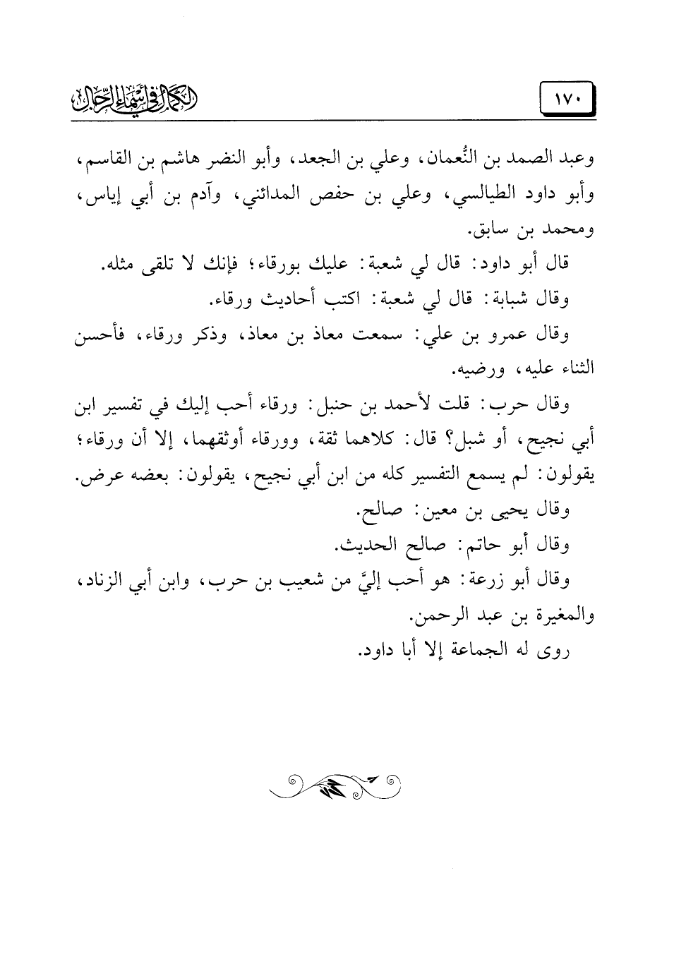 وقال حرب: قلت لأحمد بن حنبل: ورقاء أحب إليك في تفسير ابن أبي نجيح، أو شبل؟ قال: كلاهما ثقة، وورقاء أوثقهما، إلا أن ورقاء؛ يقولون: لم يسمع التفسير كله من ابن أبي نجيح، يقولون: بعضه عرض.