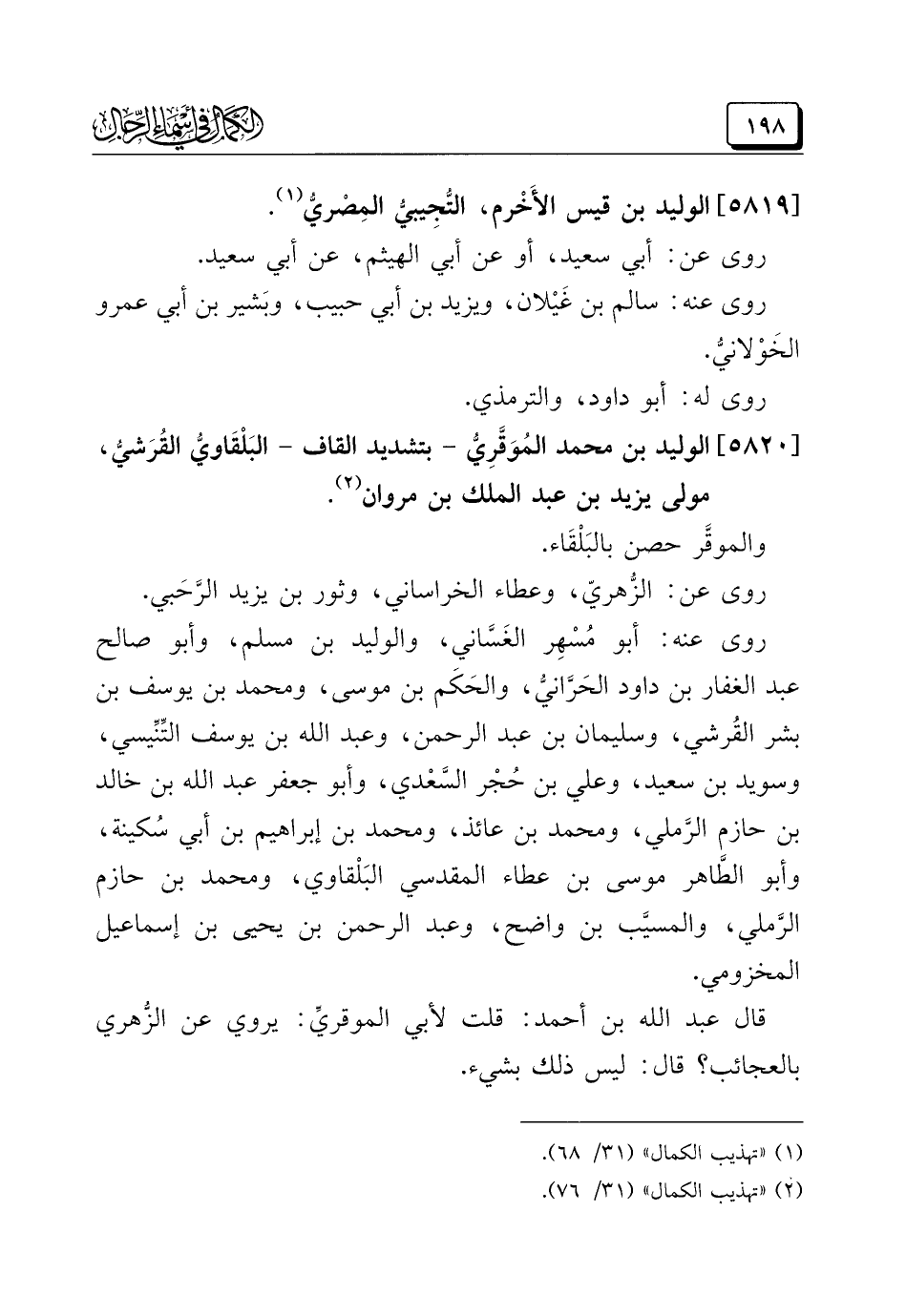 [٥٨٢٠] الوليد بن محمد المُوَقَّرِيُّ -بتشديد القاف- البَلْقَاوِيُّ القُرَشِيُّ، مولي يزيد بن عبد الملك بن مَرْوان (¬٢).