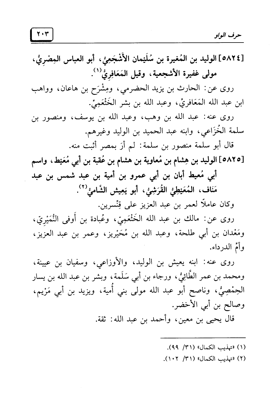 [٥٨٢٥] الوليد بن هِشام بن مُعَاوية بن هشام بن عُقبة بن أبي مُعَيْط، واسم أبي مُعيط أَبَان بن أبي عَمْرو بن أمية بن عبد شمس بن عبد مَنَاف، المُعَيْطِيُّ القُرَشِيُّ، أبو يَعِيش الشَّامِيُّ (¬٢).