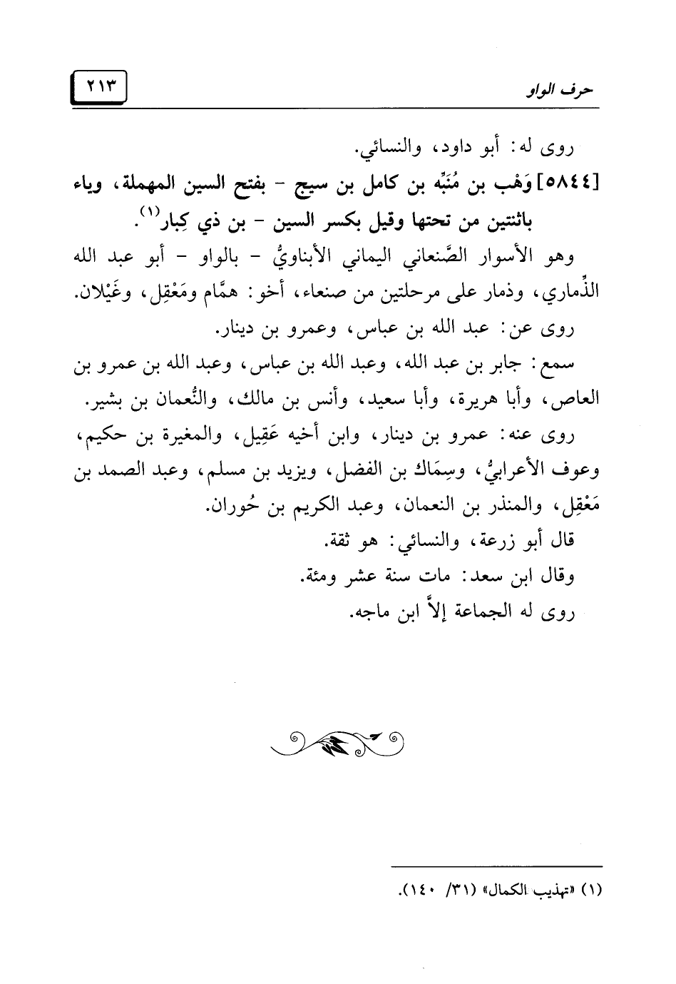 [٥٨٤٤] وَهْب بن مُنَبِّه بن كامل بن سيج -بفتح السين المهملة، وياء باثنتين من تحتها وقيل بكسر السين- بن ذي كِبار (¬١).