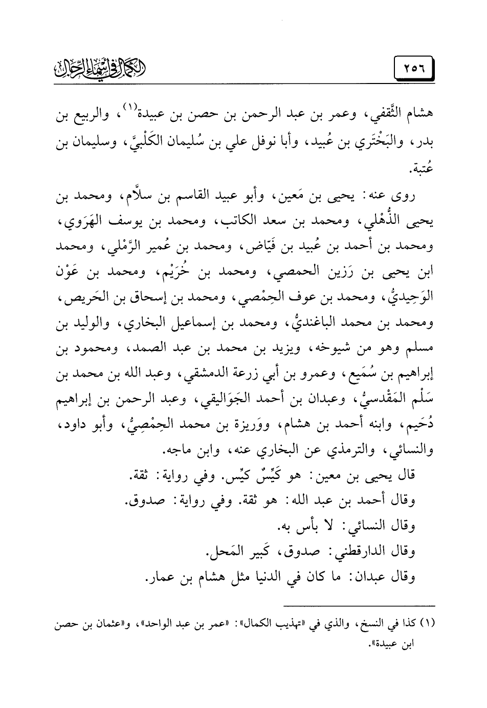 (¬١) كذا في النسخ، والذي في "تهذيب الكمال": "عمر بن عبد الواحد"، و"عثمان بن حصن ابن عبيدة".