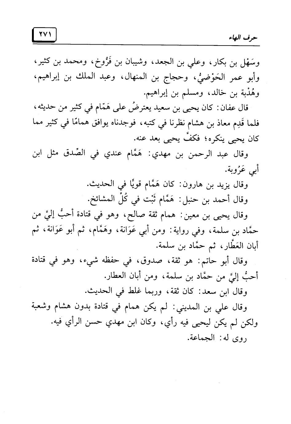 وقال يحيى بن معين: همام ثقة صالح، وهو في قتادة أحبُّ إليَّ من حمَّاد بن سلمة، وفي رواية: ومن أبي عَوَانة، وهَمَّام، ثم أبو عَوَانة، ثم أبان العَطَّار، ثم حمَّاد بن سلمة.