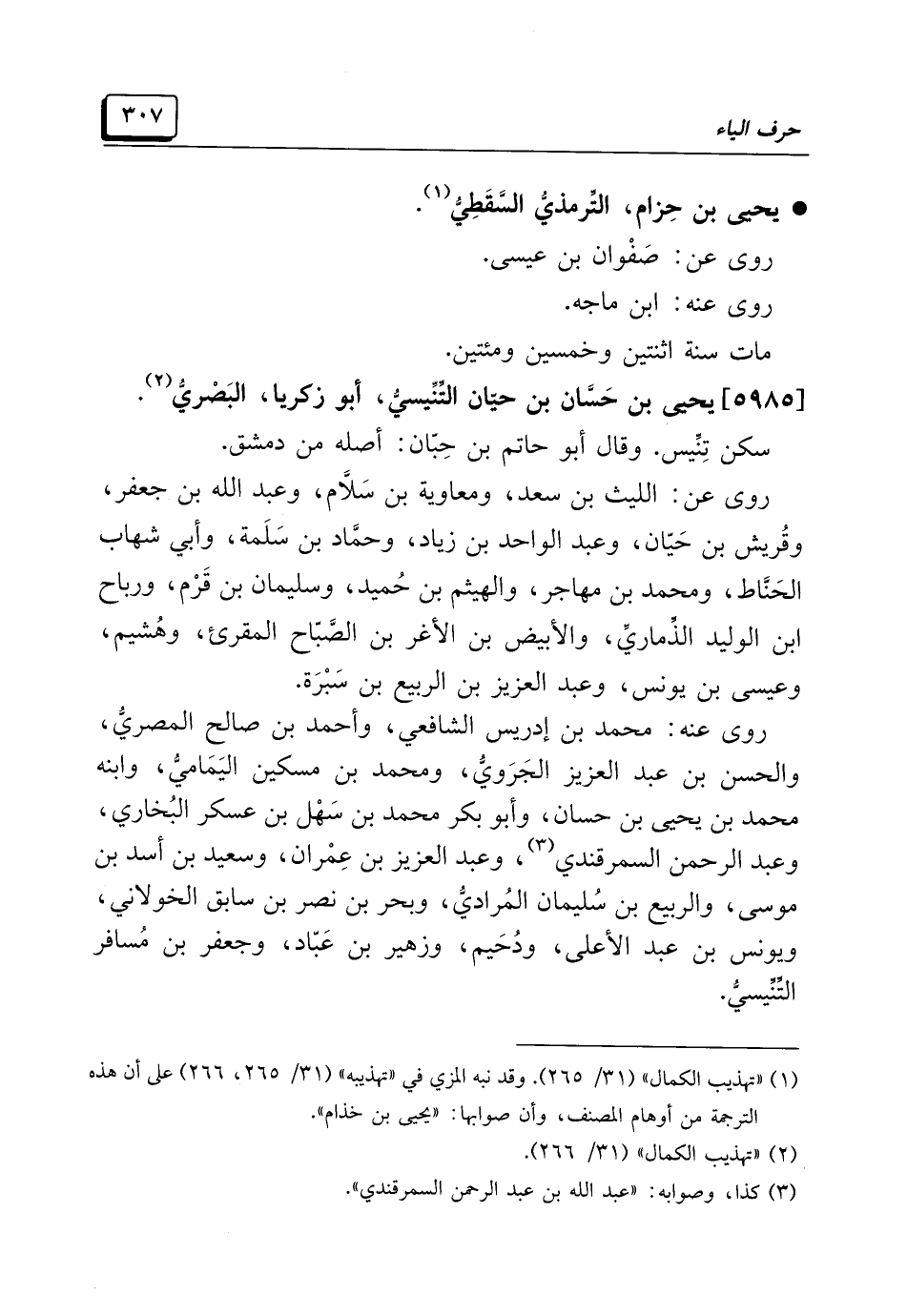 (¬١) "تهذيب الكمال" (٣١/ ٢٦٥). وقد نبه المزي في "تهذيبه" (٣١/ ٢٦٥، ٢٦٦) على أن هذه الترجمة من أوهام المصنف، وأن صوابها: "يحيي بن خذام".
