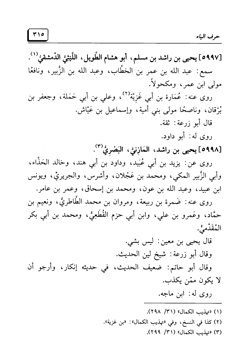 [٥٩٩٧] يحيى بن راشد بن مسلم، أبو هشام الطَّويل، اللَّيْثِيُّ الدِّمشقيُّ (¬١).
