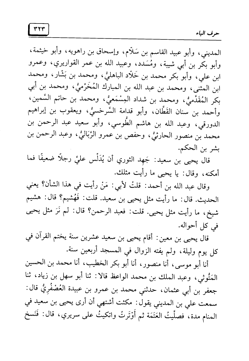 وقال عبد الله بن أحمد: قلتُ لأبي: مَنْ رأيت في هذا الشأن؟ يعني الحديث. قال: ما رأيت مثل يحيى بن سعيد. قلت: فَهُشيم؟ قال: هشيم شيخ، ما رأيت مثل يحيى. قلت: فعبد الرحمن؟ قال: لم نَرَ مثل يحيى في كل أحواله.
