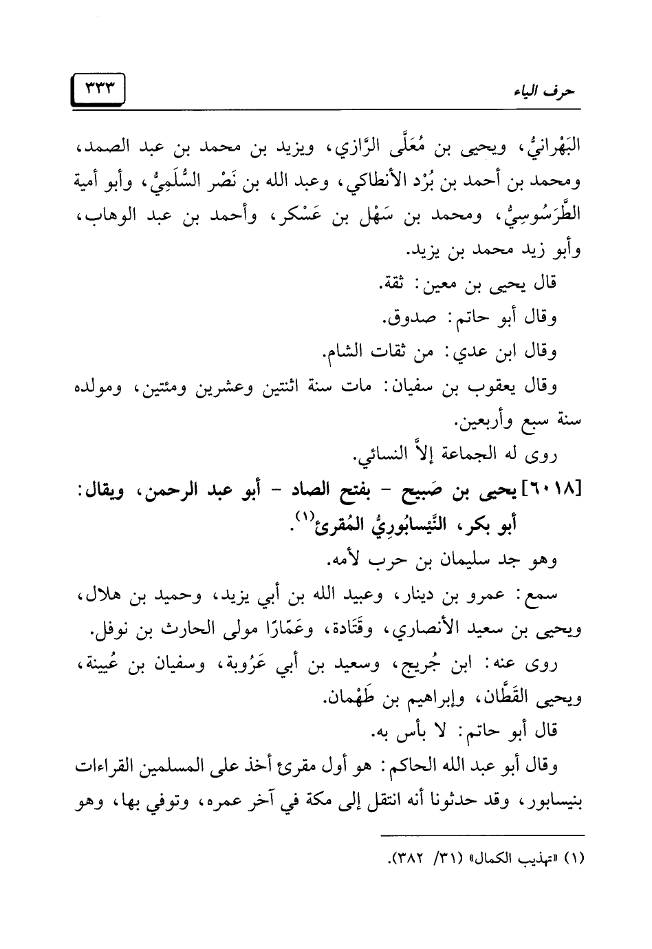 [٦٠١٨] يحيى بن صَبيح -بفتح الصاد- أبو عبد الرحمن، ويقال: أبو بكر، النَّيْسابُورِيُّ المُقرئ (¬١).
