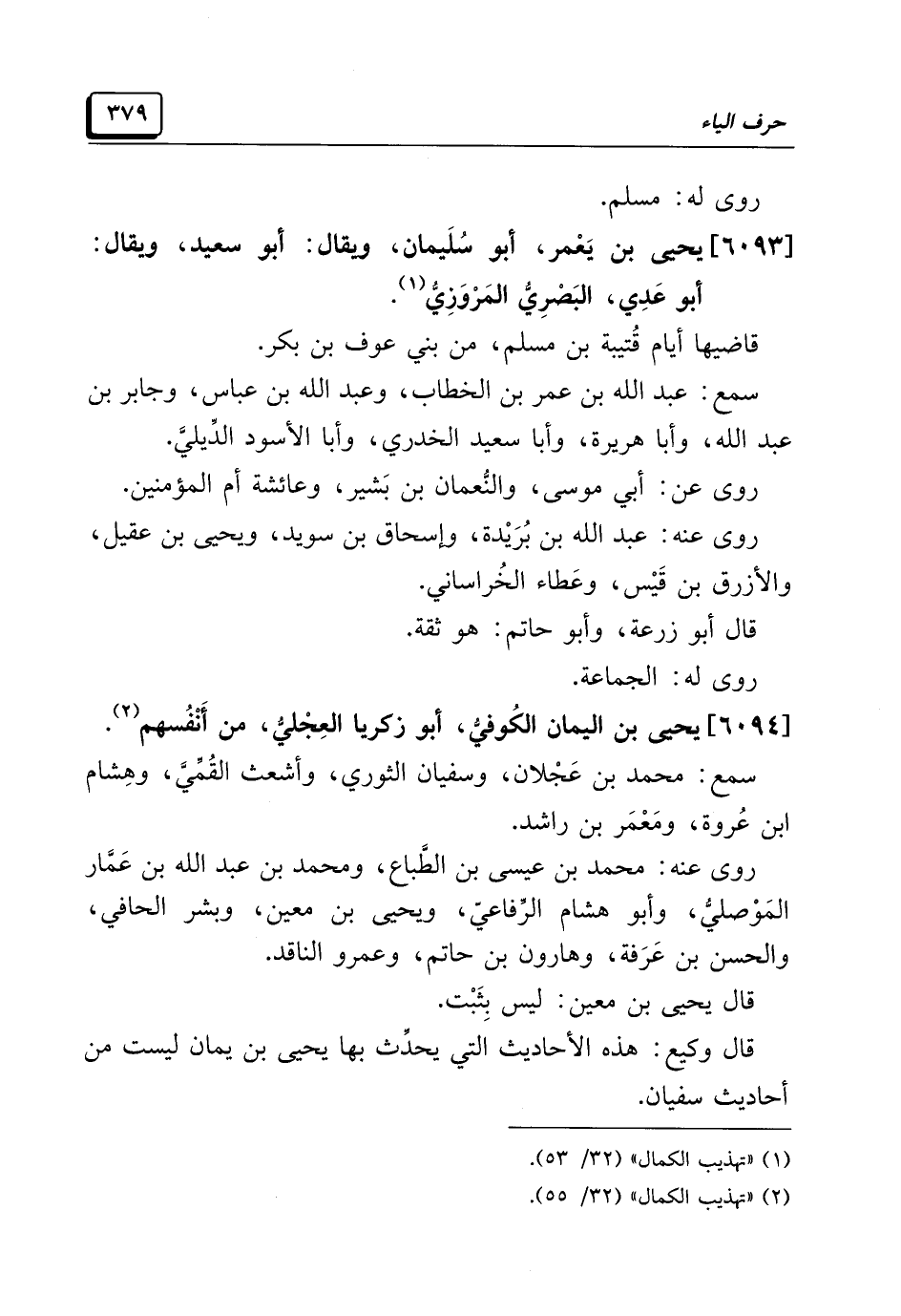 [٦٠٩٣] يحيى بن يَعْمر، أبو سُلَيمان، ويقال: أبو سعيد، ويقال: أبو عَدِي، البَصْرِيُّ المَرْوَزِيُّ (¬١).