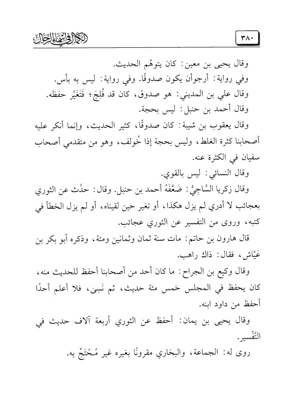 وقال يحيى بن يمان: أحفظ عن الثوري أربعة آلاف حديث في التَّفْسير.