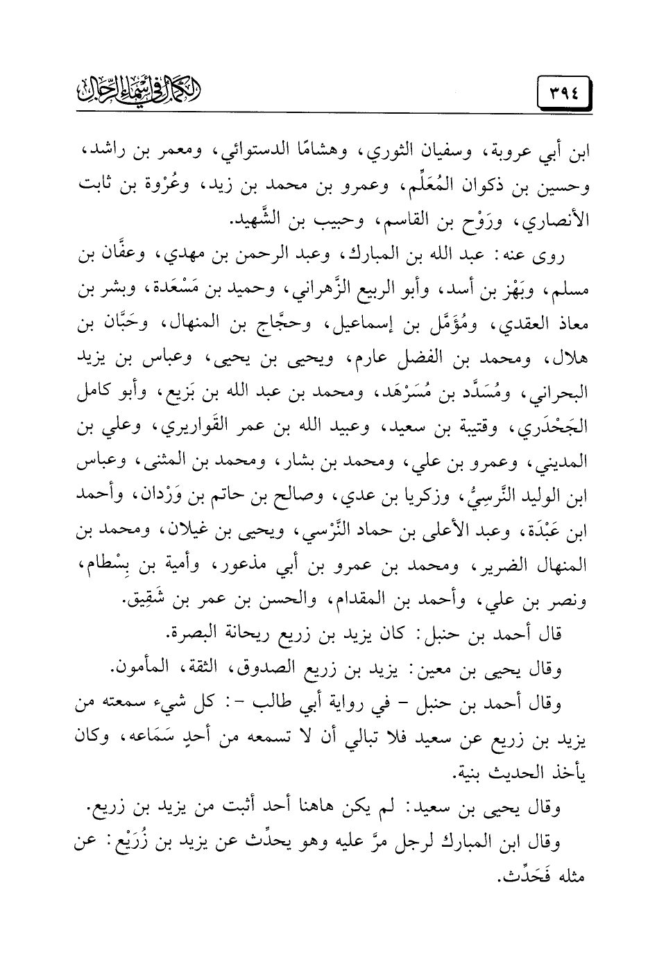 قال أحمد بن حنبل: كان يزيد بن زريع ريحانة البصرة.