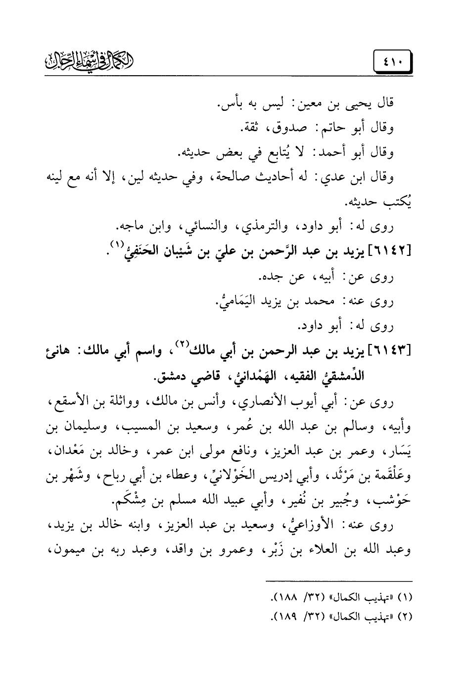 [٦١٤٣] يزيد بن عبد الرحمن بن أبي مالك (¬٢)، واسم أبي مالك: هانئ الدِّمشقيُّ الفقيه، الهَمْدانيُّ، قاضي دمشق.