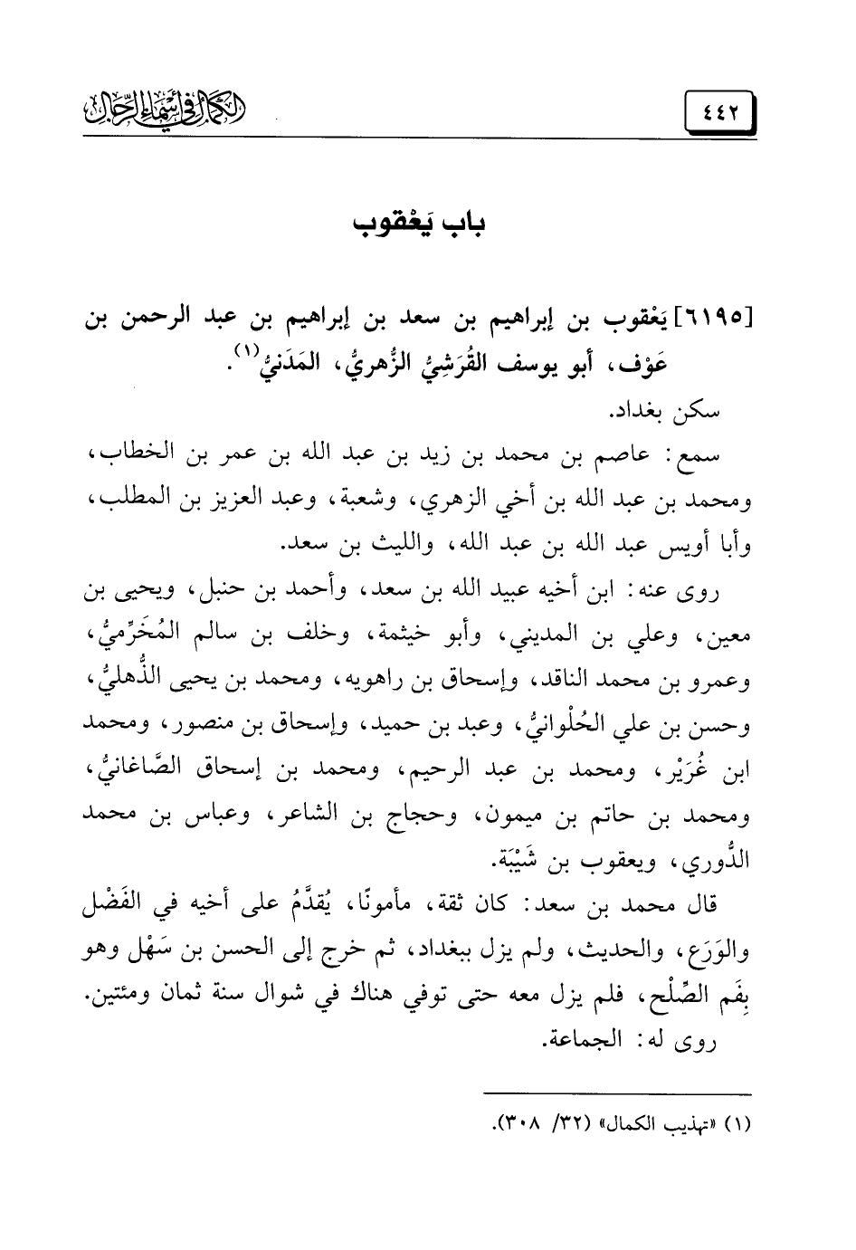 [٦١٩٥] يَعْقوب بن إبراهيم بن سعد بن إبراهيم بن عبد الرَّحمن بن عَوْف، أبو يوسف القُرَشِيُّ الزُّهْرِيُّ، المَدَنيُّ (¬١).