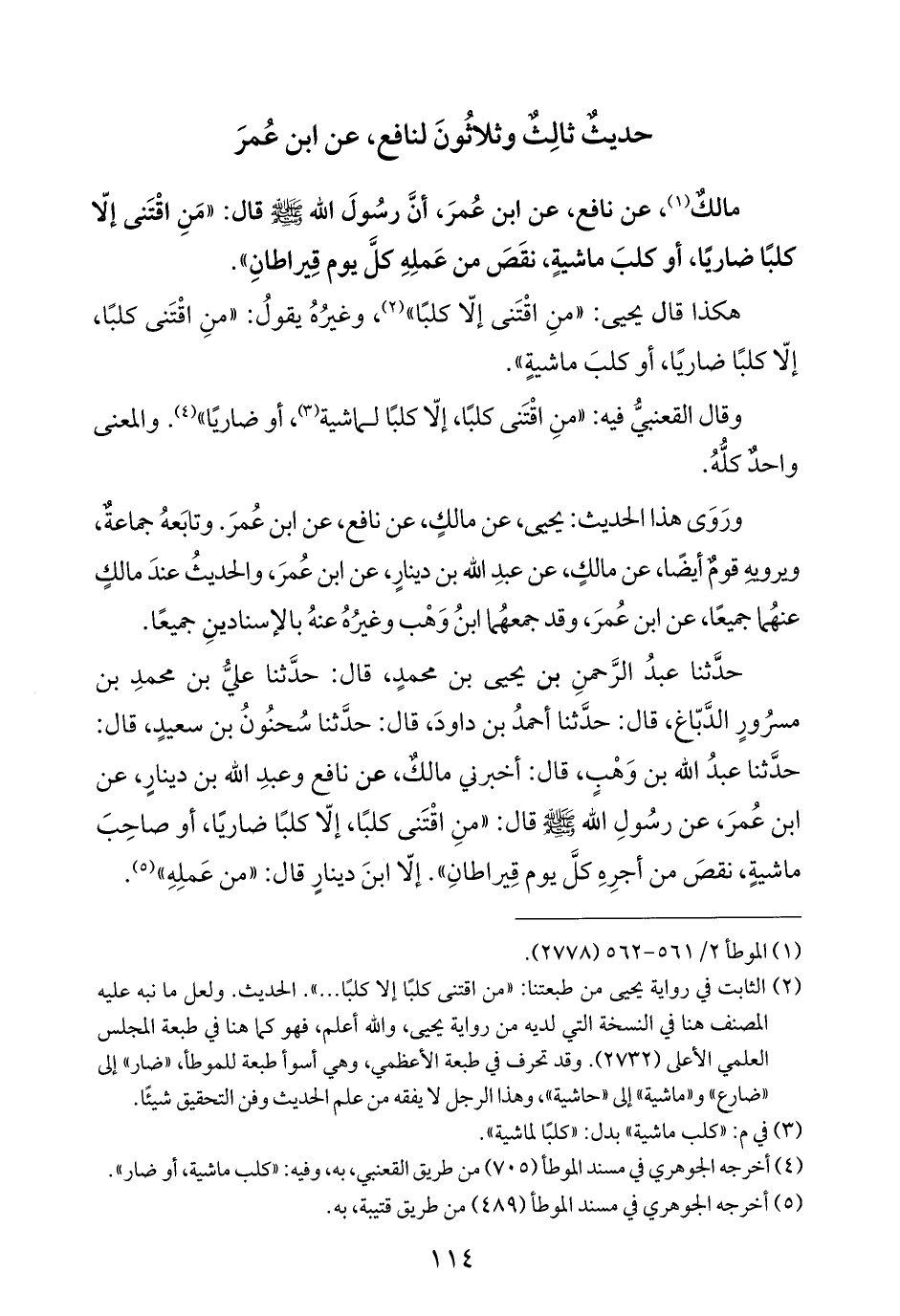 مالكٌ (¬١)، عن نافع، عن ابن عُمرَ، أنَّ رسُولَ الله - صلى الله عليه وسلم - قال: "مَنِ اقْتَنى إلّا كلبًا ضاريًا، أو كلبَ ماشيةٍ، نقَصَ من عَملِهِ كلَّ يوم قِيراطانِ".