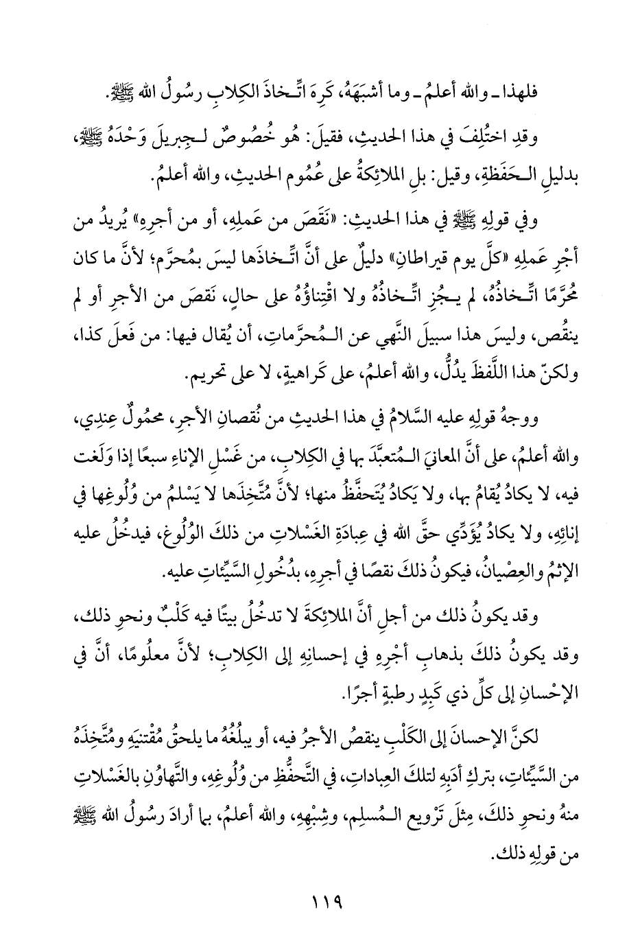 لكنَّ الإحسانَ إلى الكَلْبِ ينقصُ الأجرُ فيه، أو يبلُغُهُ ما يلحقُ مُقْتنيَهِ ومُتَّخِذَهُ من السَّيِّئاتِ، بتركِ أدَبِهِ لتلكَ العِباداتِ، في التَّحفُّظِ من وُلُوغِهِ، والتَّهاوُنِ بالغَسْلاتِ منهُ ونحوِ ذلكَ، مِثلَ تَرْويع المُسلِم، وشِبْهِهِ، واللّه أعلمُ، بما أرادَ رسُولُ الله - صلى الله عليه وسلم - من قولِهِ ذلك.