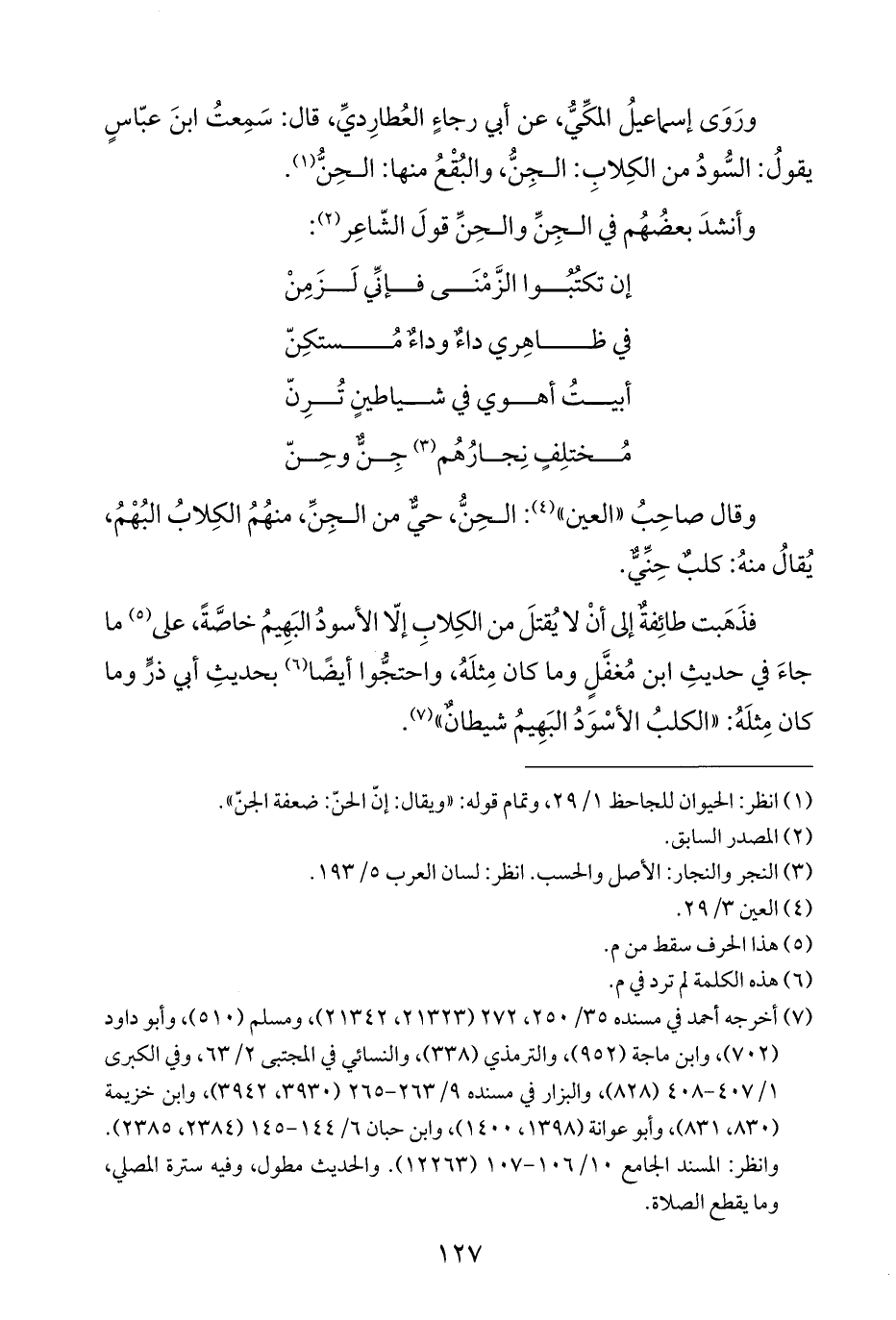 ورَوَى إسماعيلُ المكِّيُّ، عن أبي رجاءٍ العُطارِديِّ، قال: سَمِعتُ ابنَ عبّاسٍ يقولُ: السُّودُ من الكِلابِ: الجِنُّ، والبُقْعُ منها: الحِنُّ (¬١).
