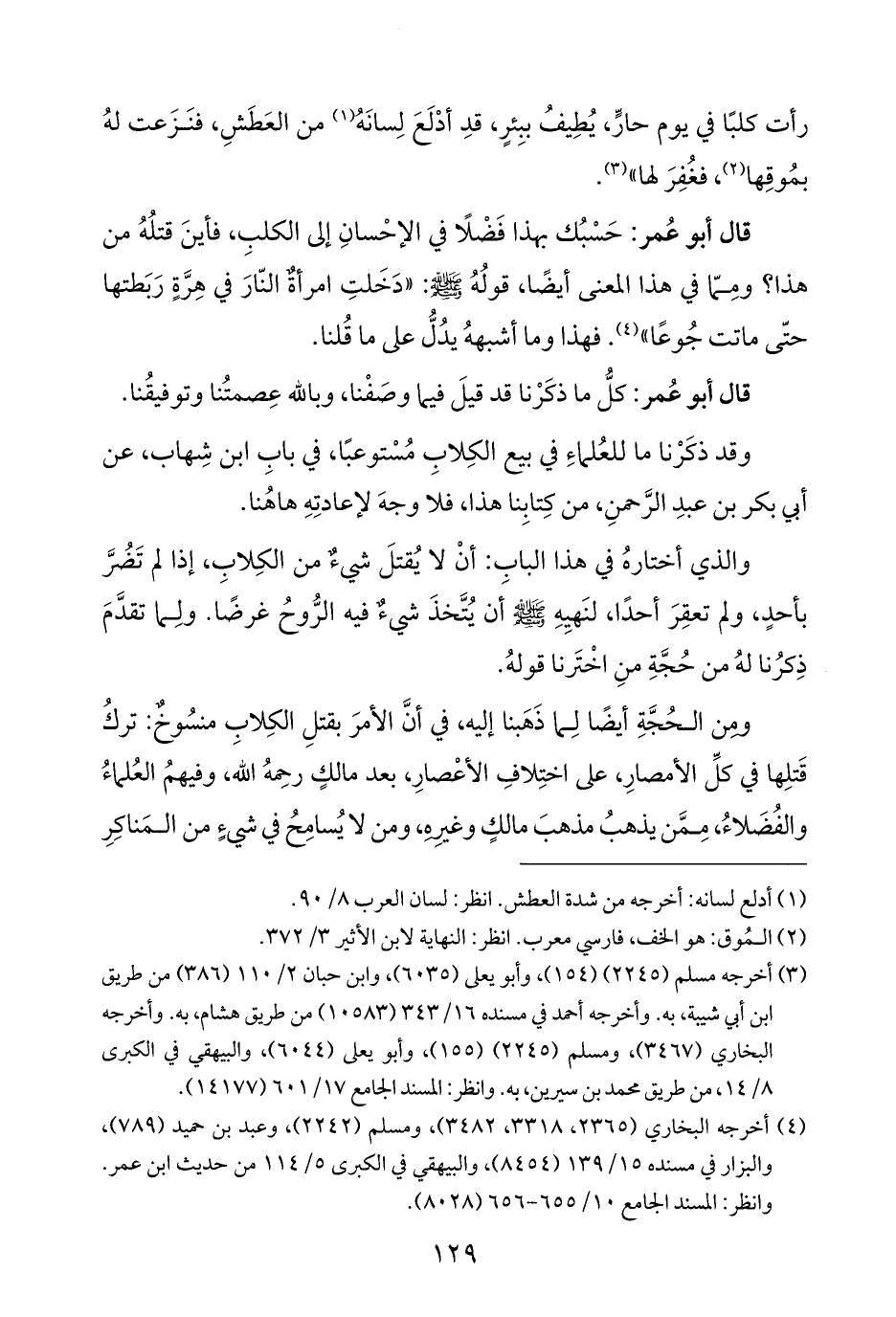 قال أبو عُمر: حَسْبُك بهذا فَضْلًا في الإحْسانِ إلى الكلبِ، فأينَ قتلُهُ من هذا؟ ومِمّا في هذا المعنى أيضًا، قولُهُ - صلى الله عليه وسلم -: "دَخَلتِ امرأةٌ النّارَ في هِرَّةٍ رَبَطتها حتَّى ماتت جُوعًا" (¬٤). فهذا وما أشبههُ يدُلُّ على ما قُلنا.